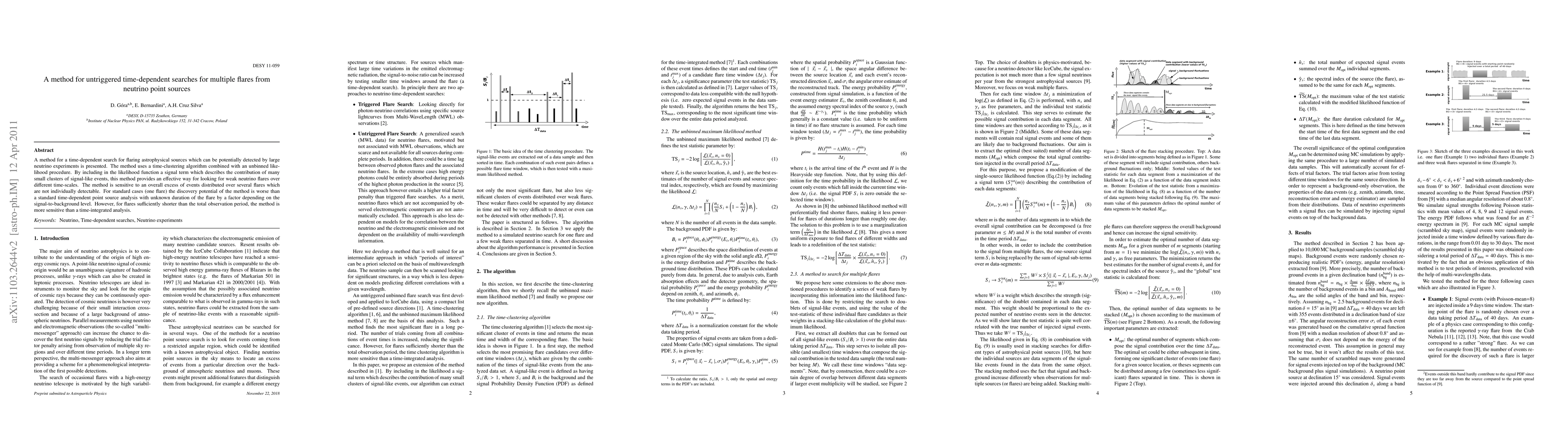 A method for a time-dependent search for flaring astrophysical sources which can be potentially detected by large neutrino experiments is presented. The method uses a time-clustering algorithm combined with an unbinned likelihood procedure. By including in the likelihood function a signal term which describes the contribution of many small clusters of signal-like events, this method provides an effective way for looking for weak neutrino flares over different time-scales. The method is sensitive to an overall excess of events distributed over several flares which are not individually detectable. For standard cases (one flare) the discovery potential of the method is about 15% worse than a standard time-dependent point source analysis with unknown duration of the flare. However, for flares sufficiently shorter than the total observation period, the method is more sensitive than a time-integrated analysis.