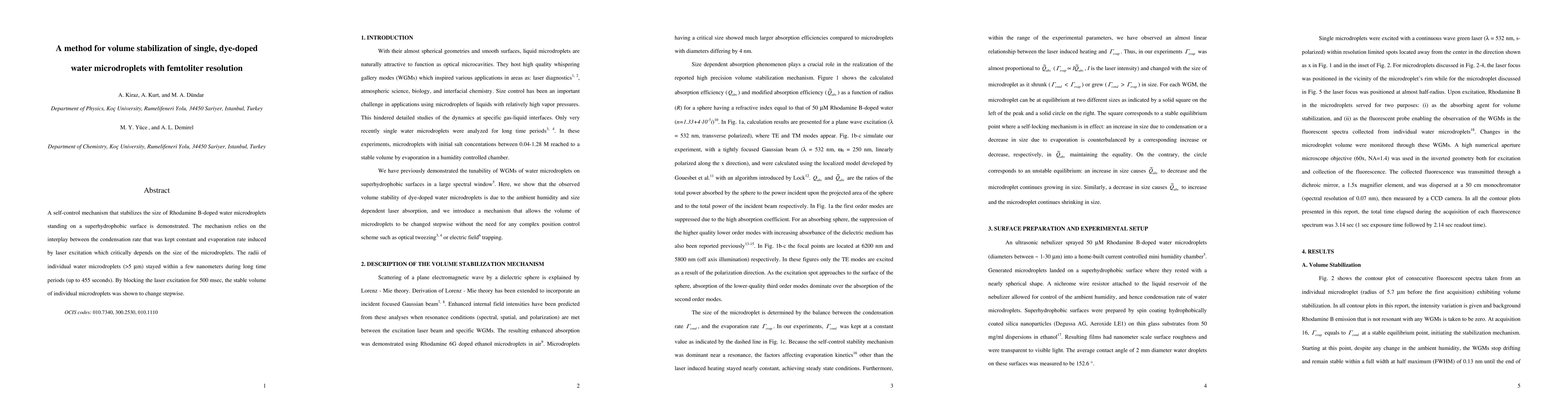 This paper presents a self-control mechanism to stabilize the volume of Rhodamine B-doped water microdroplets on a superhydrophobic surface, maintaining radii within nanometer precision over extended periods. The stabilization is achieved through balancing constant condensation and laser-induced evaporation rates dependent on droplet size.