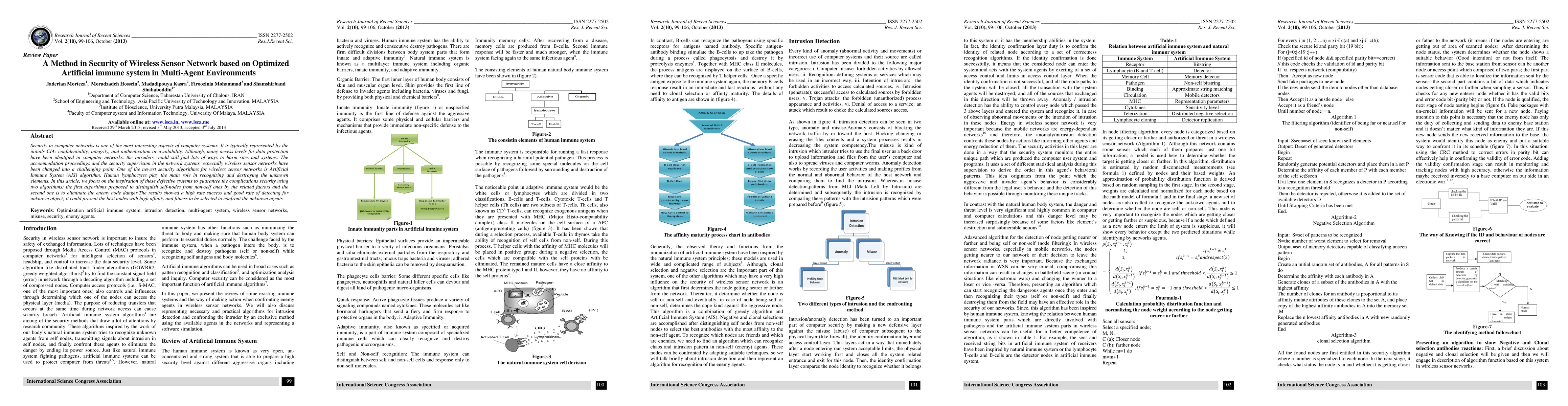 Security in computer networks is one of the most interesting aspects of computer systems. It is typically represented by the initials CIA: confidentiality, integrity, and authentication or availability. Although, many access levels for data protection have been identified in computer networks, the intruders would still find lots of ways to harm sites and systems. The accommodation proceedings and the security supervision in the network systems, especially wireless sensor networks have been changed into a challenging point. One of the newest security algorithms for wireless sensor networks is Artificial Immune System (AIS) algorithm. Human lymphocytes play the main role in recognizing and destroying the unknown elements. In this article, we focus on the inspiration of these defective systems to guarantee the complications security using two algorithms; the first algorithms proposed to distinguish self-nodes from non-self ones by the related factors and the second one is to eliminate the enemy node danger.The results showed a high rate success and good rate of detecting for unknown object; it could present the best nodes with high affinity and fitness to be selected to confront the unknown agents.