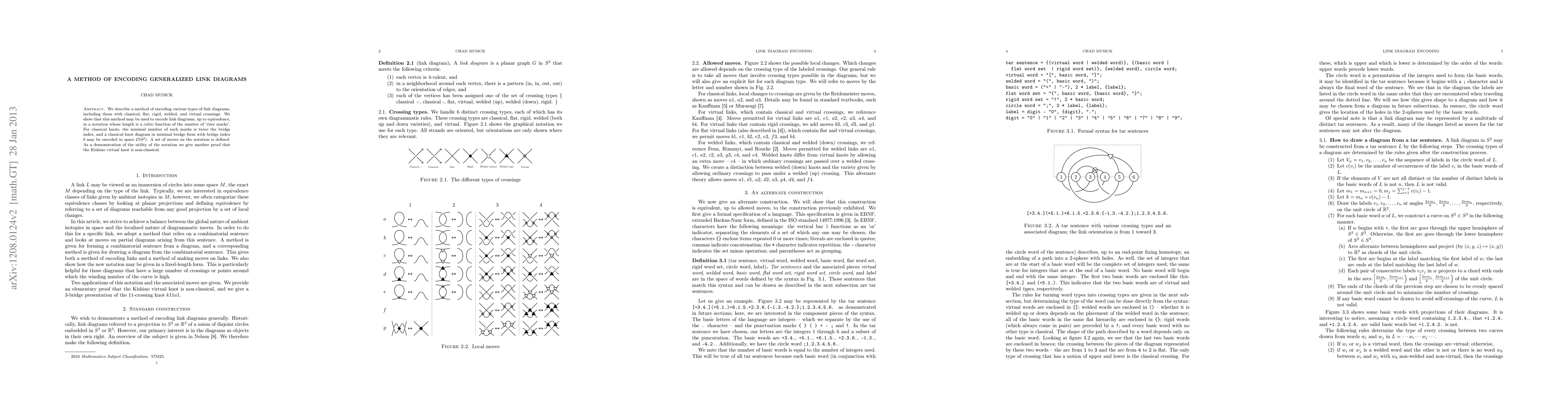 This paper presents a method for encoding generalized link diagrams, including classical, flat, rigid, welded, and virtual crossings, with a notation length that is cubic in the number of riser marks. It demonstrates the encoding of classical knots in space proportional to the square of the bridge index.
