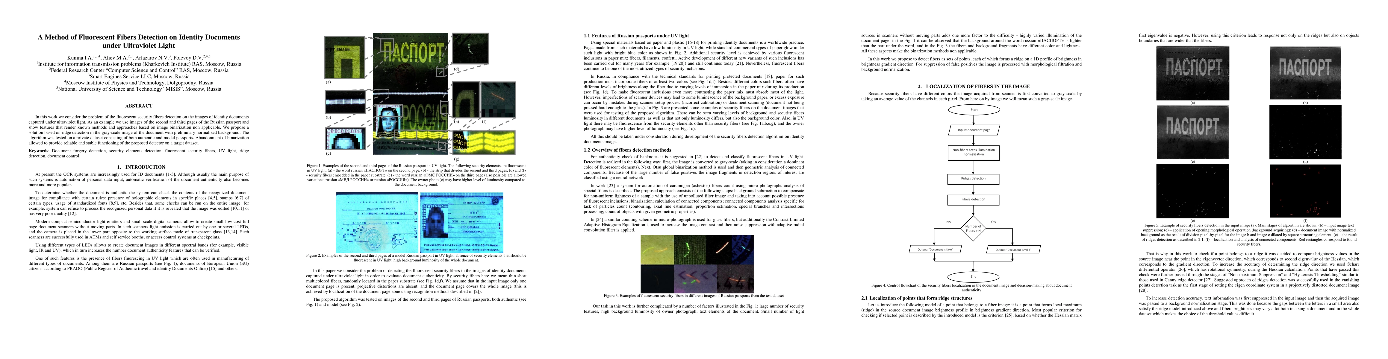 This paper proposes a method for detecting fluorescent security fibers on identity documents under ultraviolet light, avoiding the limitations of binarization-based approaches. The solution utilizes ridge detection in normalized gray-scale images, which was tested on authentic and model passports, demonstrating reliable and stable performance.