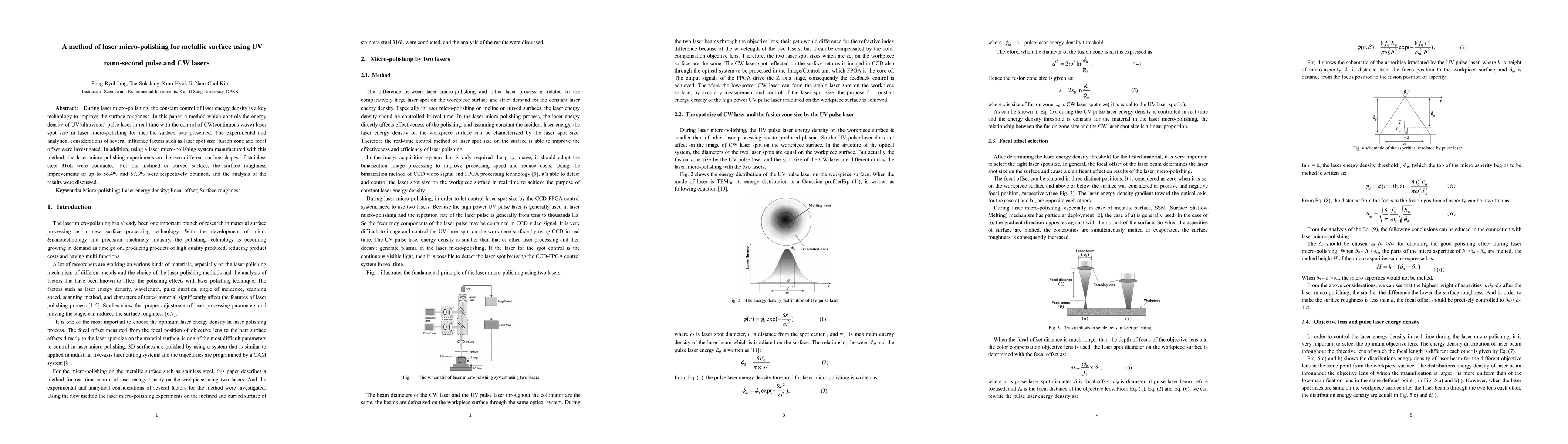 During laser micro-polishing, the constant control of laser energy density is a key technology to improve the surface roughness. In this paper, a method which controls the energy density of UV(ultraviolet) pulse laser in real time with the control of CW(continuous wave) laser spot size in laser micro-polishing for metallic surface was presented. The experimental and analytical considerations of several influence factors such as laser spot size, fusion zone and focal offset were investigated. In addition, using a laser micro-polishing system manufactured with this method, the laser micro-polishing experiments on the two different surface shapes of stainless steel 316L were conducted. For the inclined or curved surface, the surface roughness improvements of up to 56.4% and 57.3% were respectively obtained, and the analysis of the results were discussed.