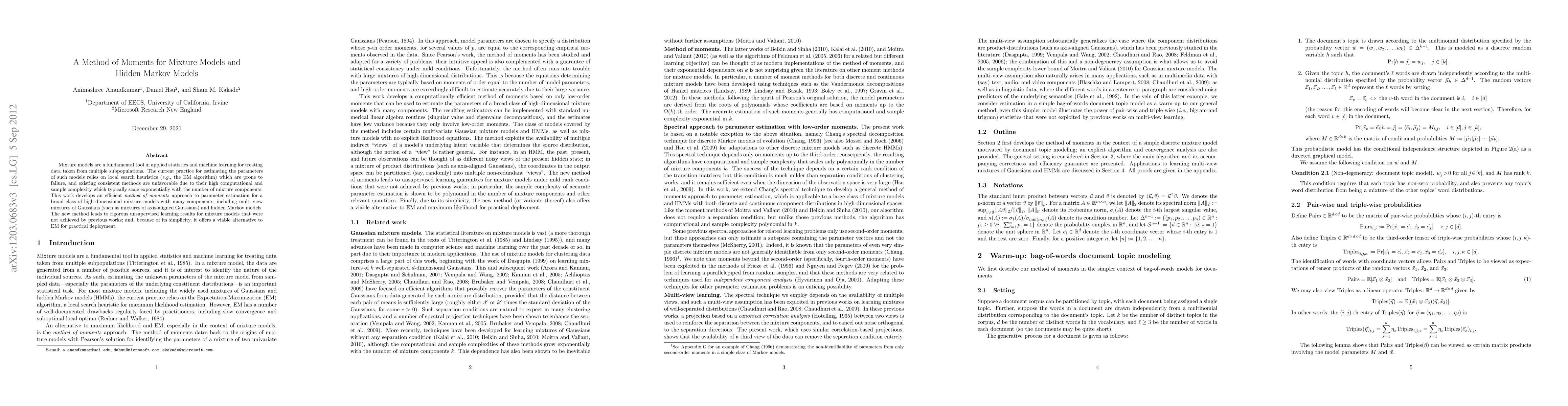 This paper proposes an efficient method of moments for parameter estimation in high-dimensional mixture models and hidden Markov models, offering a simpler and more scalable alternative to the EM algorithm while achieving rigorous unsupervised learning results. The method addresses the computational and sample complexity issues of existing consistent methods.