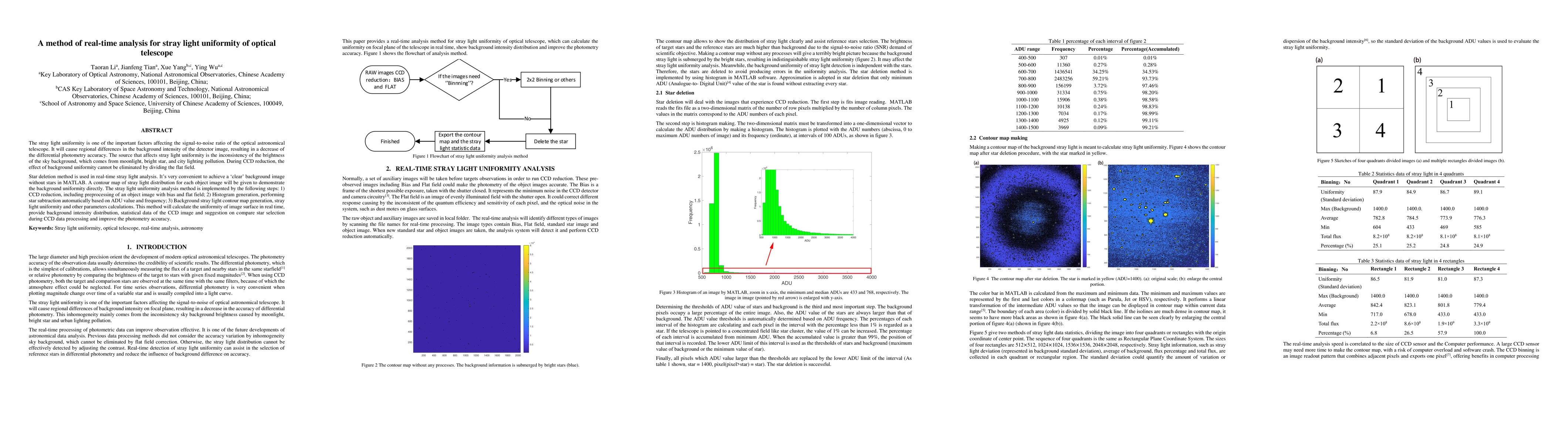 This paper presents a method for real-time analysis of stray light uniformity in optical telescopes, aiming to improve signal-to-noise ratio and photometry accuracy. The method involves CCD reduction, star deletion, and generation of stray light contour maps to assess background uniformity and suggest optimal star selections.