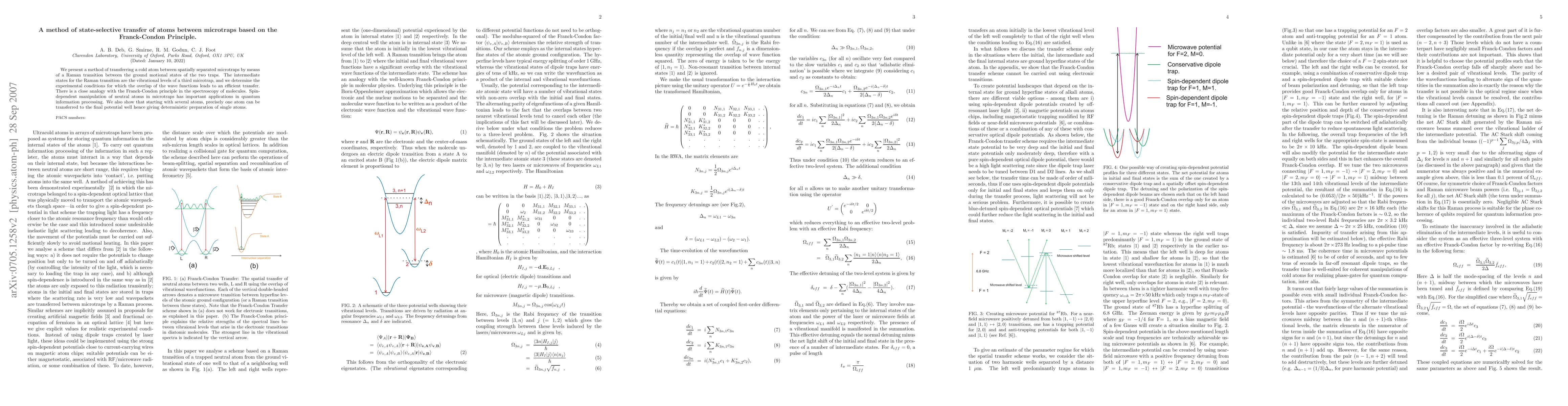 This paper introduces a method for state-selective transfer of cold atoms between microtraps using Raman transitions, leveraging vibrational levels of a third microtrap and the Franck-Condon principle for efficient atom transfer. The technique enables deterministic preparation of single atoms, with implications for quantum information processing.