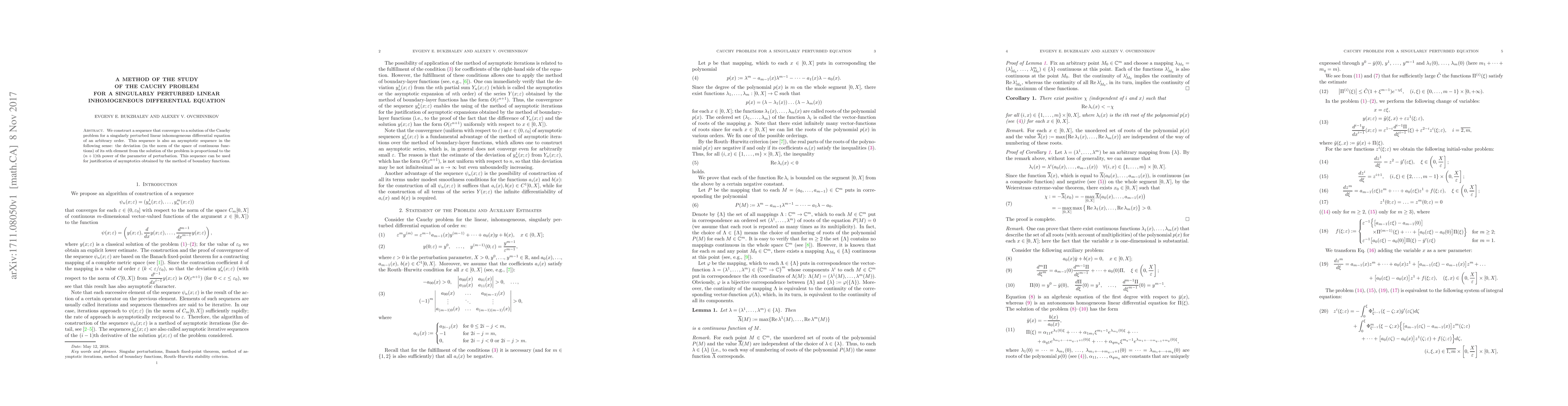 This paper develops a sequence converging to the solution of a singularly perturbed linear inhomogeneous differential equation's Cauchy problem, with the $n$th element's deviation proportional to the $(n+1)$th power of the perturbation parameter, supporting asymptotics obtained via boundary function methods.