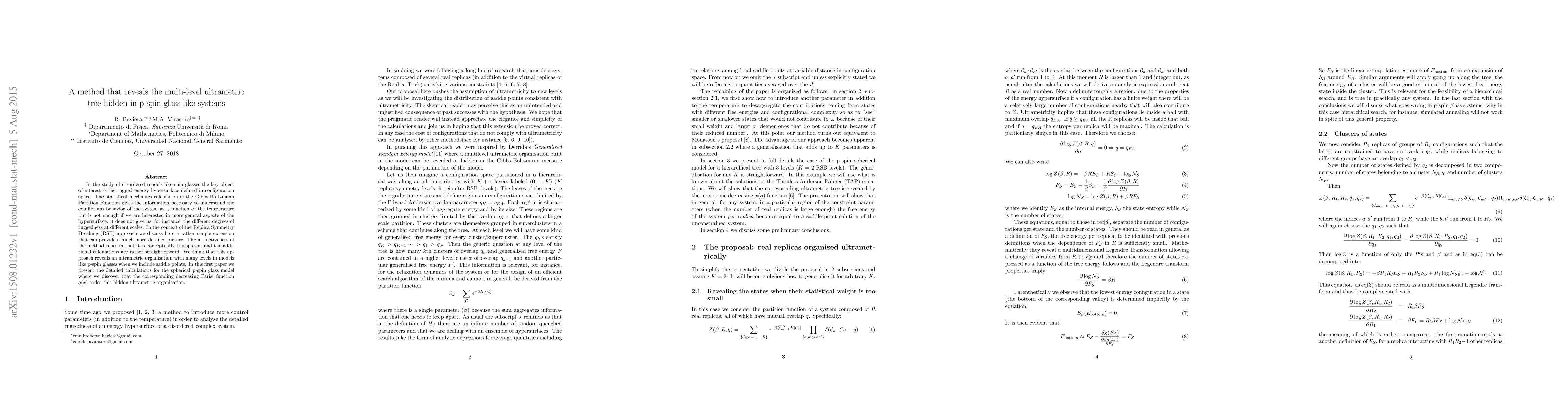 In the study of disordered models like spin glasses the key object of interest is the rugged energy hypersurface defined in configuration space. The statistical mechanics calculation of the Gibbs-Boltzmann Partition Function gives the information necessary to understand the equilibrium behavior of the system as a function of the temperature but is not enough if we are interested in more general aspects of the hypersurface: it does not give us, for instance, the different degrees of ruggedness at different scales. In the context of the Replica Symmetry Breaking (RSB) approach we discuss here a rather simple extension that can provide a much more detailed picture. The attractiveness of the method relies in that it is conceptually transparent and the additional calculations are rather straightforward. We think that this approach reveals an ultrametric organisation with many levels in models like p-spin glasses when we include saddle points. In this first paper we present the detailed calculations for the spherical p-spin glass model where we discover that the corresponding decreasing Parisi function $q(x)$ codes this hidden ultrametric organisation.