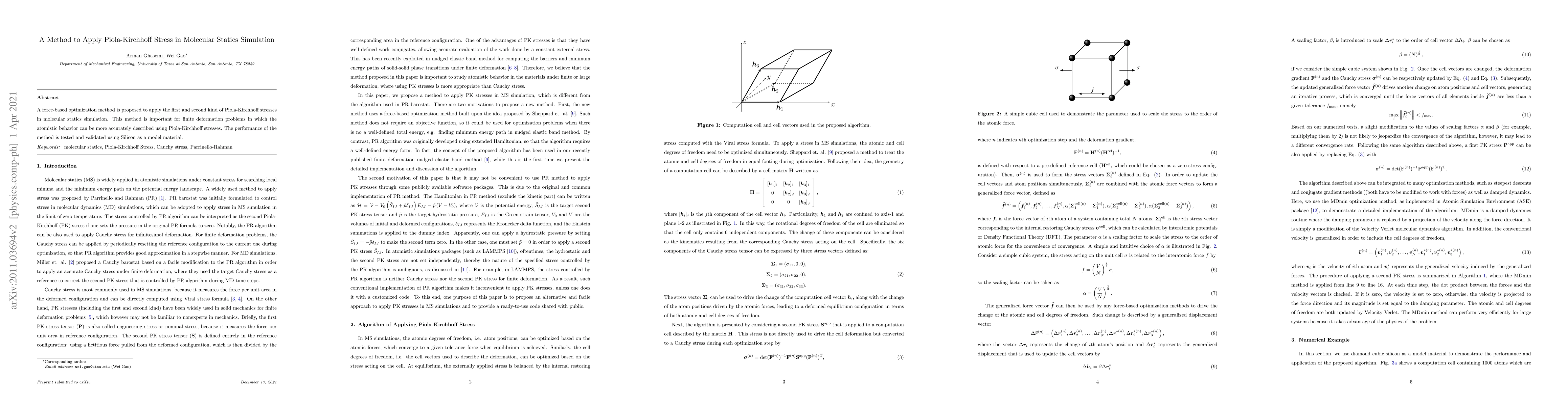 This paper proposes a force-based optimization method to apply Piola-Kirchhoff stresses in molecular statics simulations, enhancing accuracy for finite deformation problems. Validation of the method is demonstrated using Silicon as a test material.