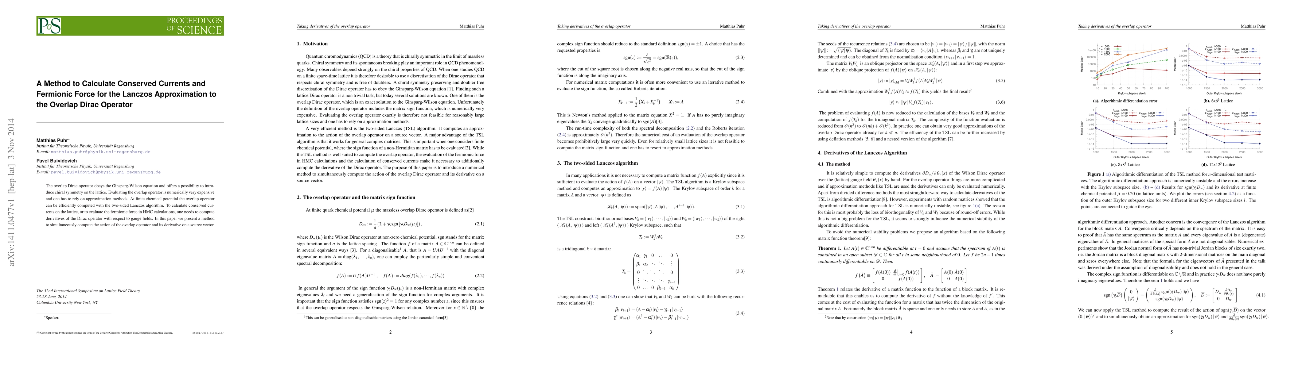 This paper introduces a method for efficiently calculating conserved currents and fermionic force using the Lanczos approximation for the overlap Dirac operator, which is crucial for lattice computations at finite chemical potential. The proposed method simultaneously computes the action of the overlap operator and its derivative on a source vector, enhancing the efficiency of simulations.