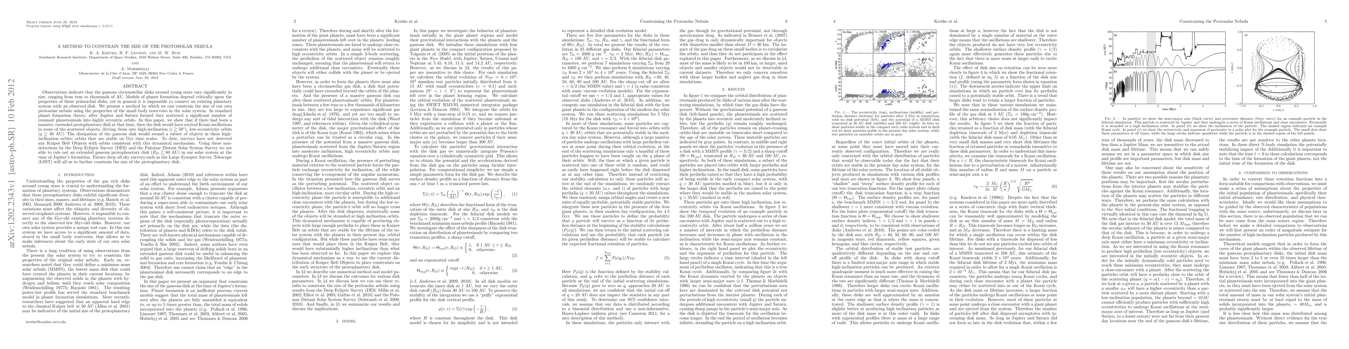 Observations indicate that the gaseous circumstellar disks around young stars vary significantly in size, ranging from tens to thousands of AU. Models of planet formation depend critically upon the properties of these primordial disks, yet in general it is impossible to connect an existing planetary system with an observed disk. We present a method by which we can constrain the size of our own protosolar nebula using the properties of the small body reservoirs in the solar system. In standard planet formation theory, after Jupiter and Saturn formed they scattered a significant number of remnant planetesimals into highly eccentric orbits. In this paper, we show that if there had been a massive, extended protoplanetary disk at that time, then the disk would have excited Kozai oscillations in some of the scattered objects, driving them into high-inclination (i > 50 deg), low-eccentricity orbits (q > 30 AU). The dissipation of the gaseous disk would strand a subset of objects in these high-inclination orbits; orbits that are stable on Gyr time scales. To date, surveys have not detected any Kuiper Belt Objects with orbits consistent with this dynamical mechanism. Using these non-detections by the Deep Ecliptic Survey (DES) and the Palomar Distant Solar System Survey we are able to rule out an extended gaseous protoplanetary disk (R_D > 80 AU) in our solar system at the time of Jupiter's formation. Future deep all sky surveys such as the Large Synoptic Survey Telescope (LSST) will all us to further constrain the size of the protoplanetary disk.