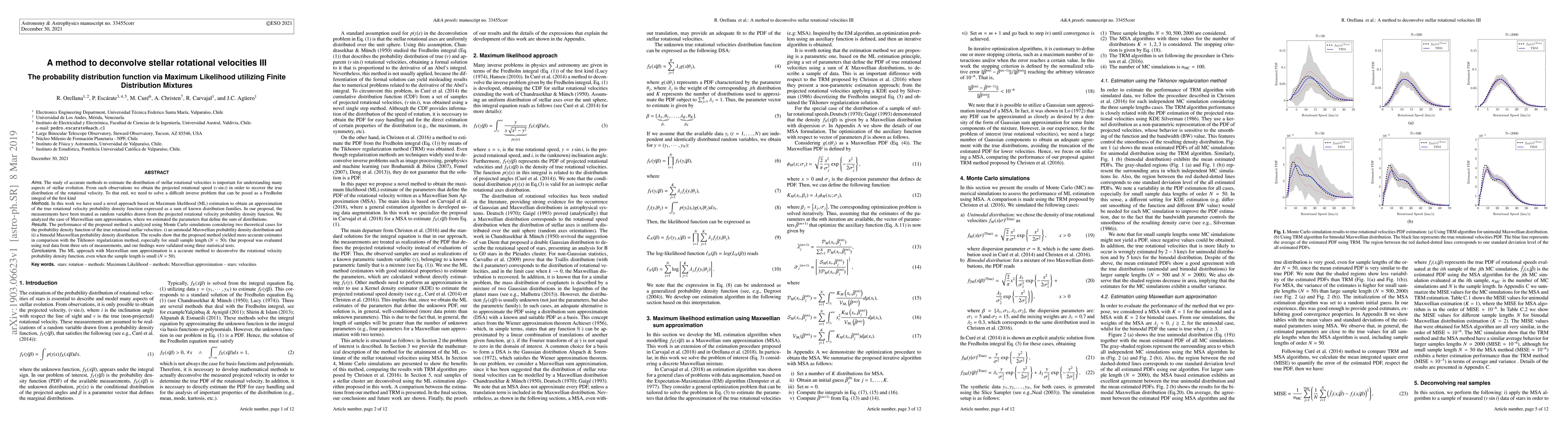 This paper proposes a Maximum Likelihood (ML) estimation method to accurately estimate the probability distribution of stellar rotational velocities, addressing the inverse problem via a sum of known distribution families. The method was tested against Monte Carlo simulations and real data, showing improved accuracy over the Tikhonov regularization method, especially for small sample sizes.