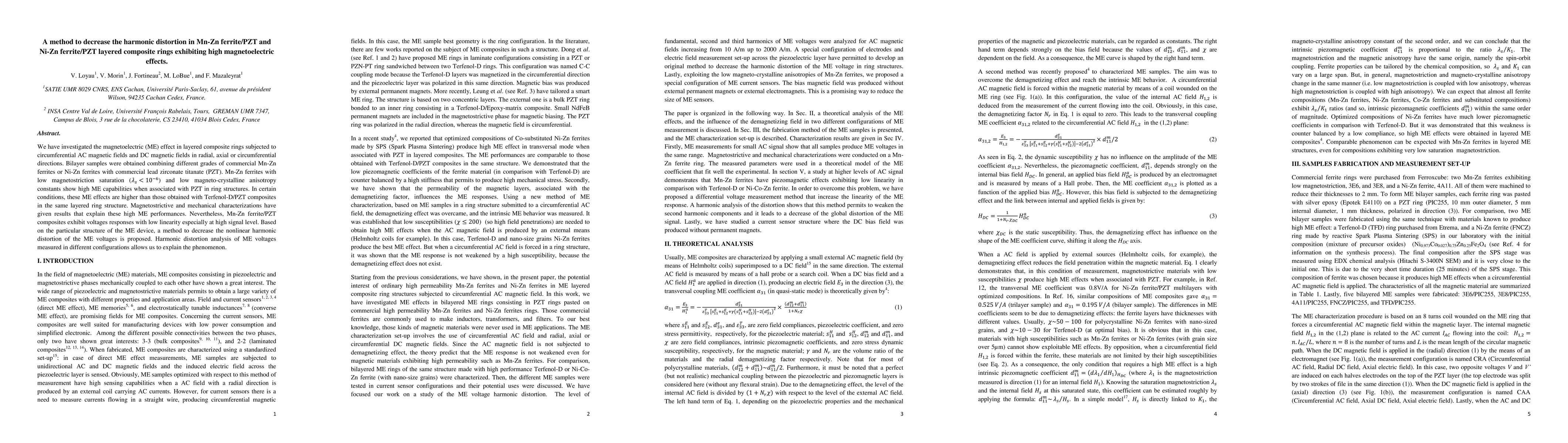 This paper investigates the magnetoelectric effect in layered composite rings combining Mn-Zn or Ni-Zn ferrites with PZT, finding high ME capabilities in Mn-Zn ferrite/PZT composites. A method is proposed to reduce the nonlinear harmonic distortion in the voltage responses of these composites.