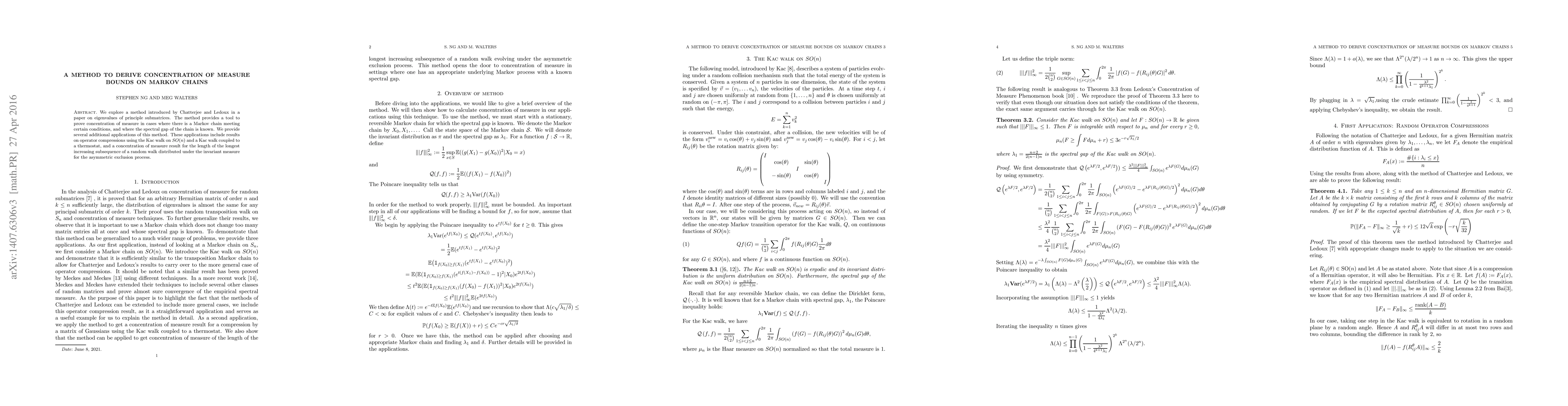 We explore a method introduced by Chatterjee and Ledoux in a paper on eigenvalues of principle submatrices. The method provides a tool to prove concentration of measure in cases where there is a Markov chain meeting certain conditions, and where the spectral gap of the chain is known. We provide several additional applications of this method. These applications include results on operator compressions using the Kac walk on $SO(n)$ and a Kac walk coupled to a thermostat, and a concentration of measure result for the length of the longest increasing subsequence of a random walk distributed under the invariant measure for the asymmetric exclusion process.