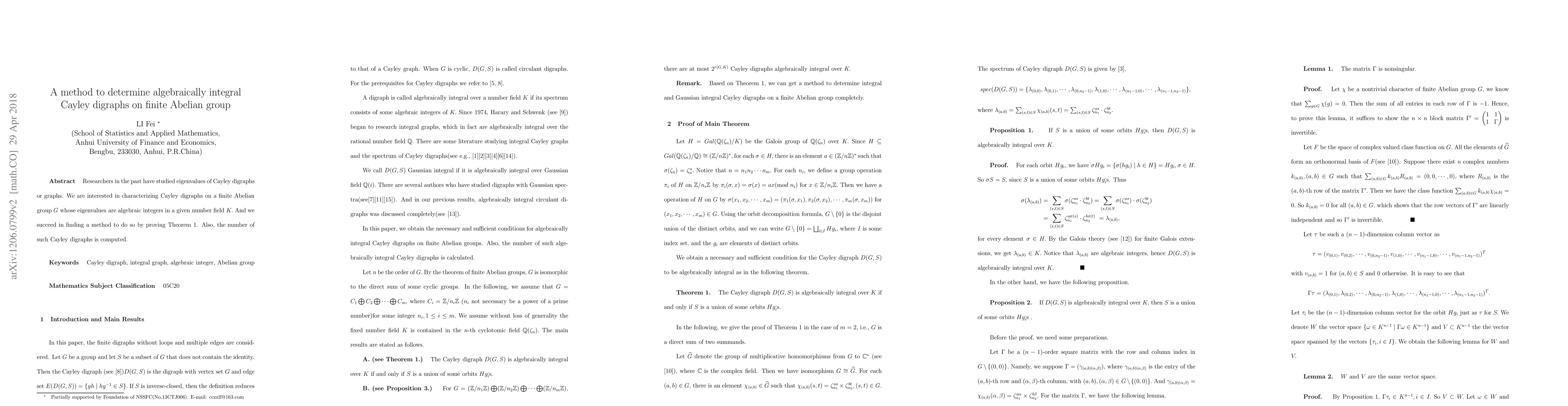 This paper presents a method to identify Cayley digraphs on finite Abelian groups whose eigenvalues are algebraic integers in a specified number field. The authors prove Theorem 1 to characterize these graphs and compute their count.
