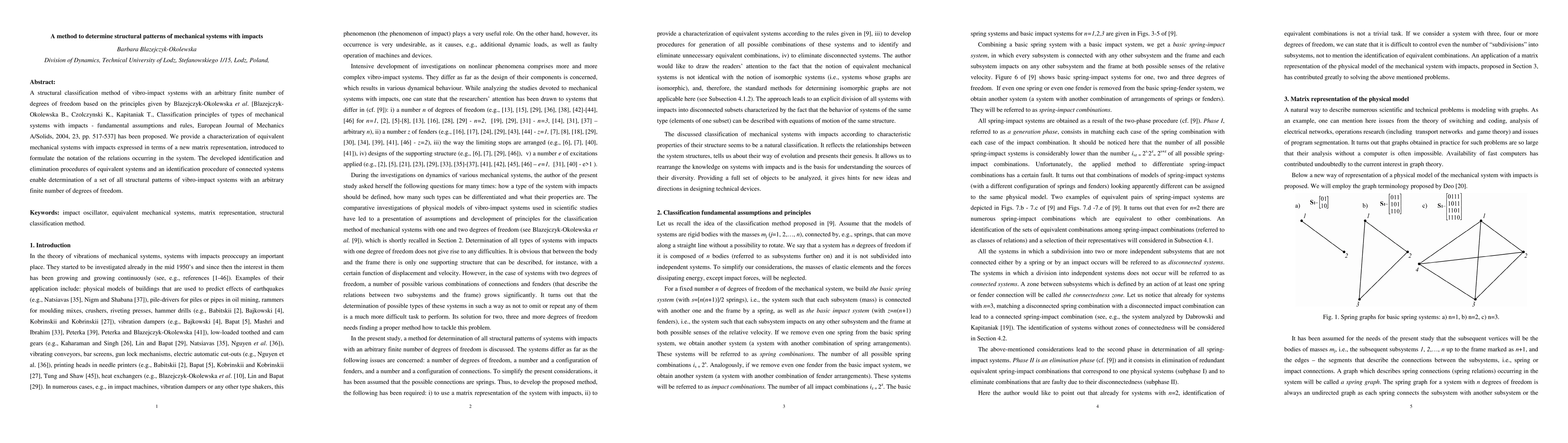 A structural classification method of vibro-impact systems with an arbitrary finite number of degrees of freedom based on the principles given by Blazejczyk-Okolewska et al. [Blazejczyk- Okolewska B., Czolczynski K., Kapitaniak T., Classification principles of types of mechanical systems with impacts - fundamental assumptions and rules, European Journal of Mechanics A/Solids, 2004, 23, pp. 517-537] has been proposed. We provide a characterization of equivalent mechanical systems with impacts expressed in terms of a new matrix representation, introduced to formulate the notation of the relations occurring in the system. The developed identification and elimination procedures of equivalent systems and an identification procedure of connected systems enable determination of a set of all structural patterns of vibro-impact systems with an arbitrary finite number of degrees of freedom.