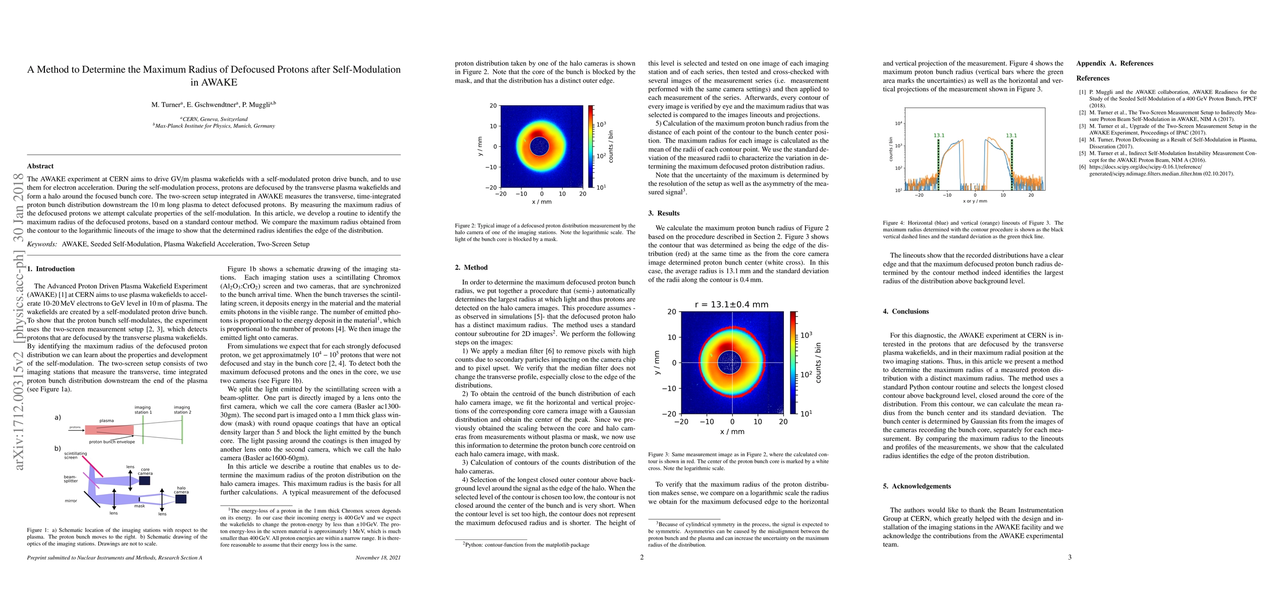 The AWAKE experiment at CERN aims to drive GV/m plasma wakefields with a self-modulated proton drive bunch, and to use them for electron acceleration. During the self-modulation process, protons are defocused by the transverse plasma wakefields and form a halo around the focused bunch core. The two-screen setup integrated in AWAKE measures the transverse, time-integrated proton bunch distribution downstream the \unit[10]{m} long plasma to detect defocused protons. By measuring the maximum radius of the defocused protons we attempt calculate properties of the self-modulation. In this article, we develop a routine to identify the maximum radius of the defocused protons, based on a standard contour method. We compare the maximum radius obtained from the contour to the logarithmic lineouts of the image to show that the determined radius identifies the edge of the distribution.