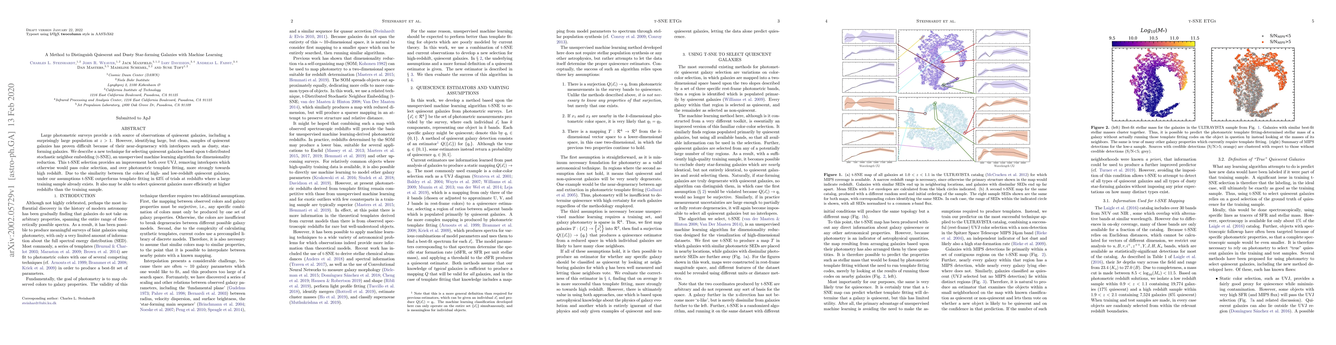 Large photometric surveys provide a rich source of observations of quiescent galaxies, including a surprisingly large population at z>1. However, identifying large, but clean, samples of quiescent galaxies has proven difficult because of their near-degeneracy with interlopers such as dusty, star-forming galaxies. We describe a new technique for selecting quiescent galaxies based upon t-distributed stochastic neighbor embedding (t-SNE), an unsupervised machine learning algorithm for dimensionality reduction. This t-SNE selection provides an improvement both over UVJ, removing interlopers which otherwise would pass color selection, and over photometric template fitting, more strongly towards high redshift. Due to the similarity between the colors of high- and low-redshift quiescent galaxies, under our assumptions t-SNE outperforms template fitting in 63% of trials at redshifts where a large training sample already exists. It also may be able to select quiescent galaxies more efficiently at higher redshifts than the training sample.