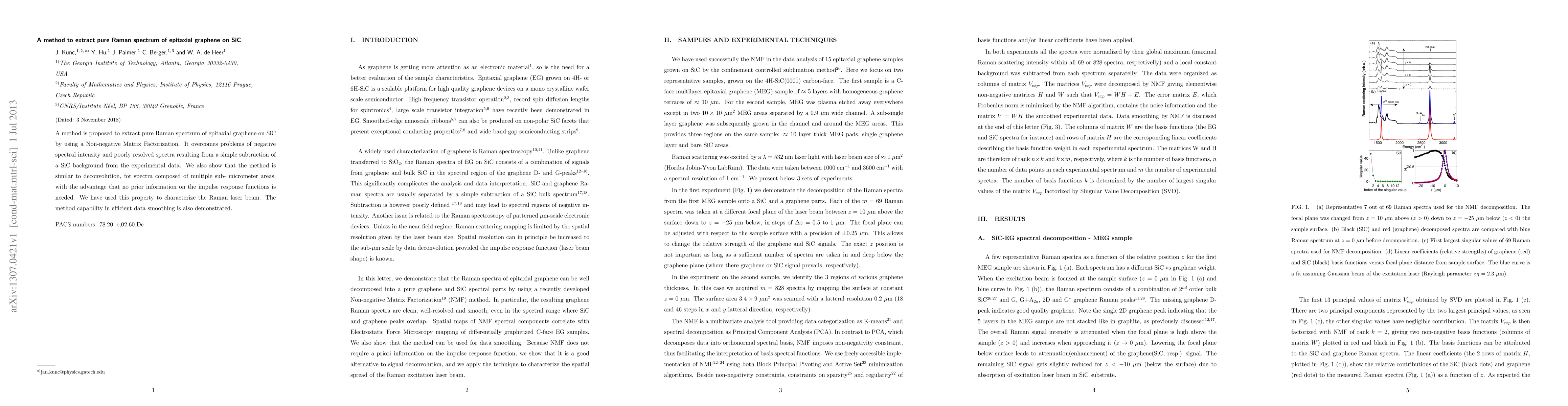 This paper proposes a Non-negative Matrix Factorization method for extracting pure Raman spectra of epitaxial graphene on SiC, overcoming negative spectral intensity and poor resolution issues. The method, similar to deconvolution, requires no prior information and effectively smooths data.