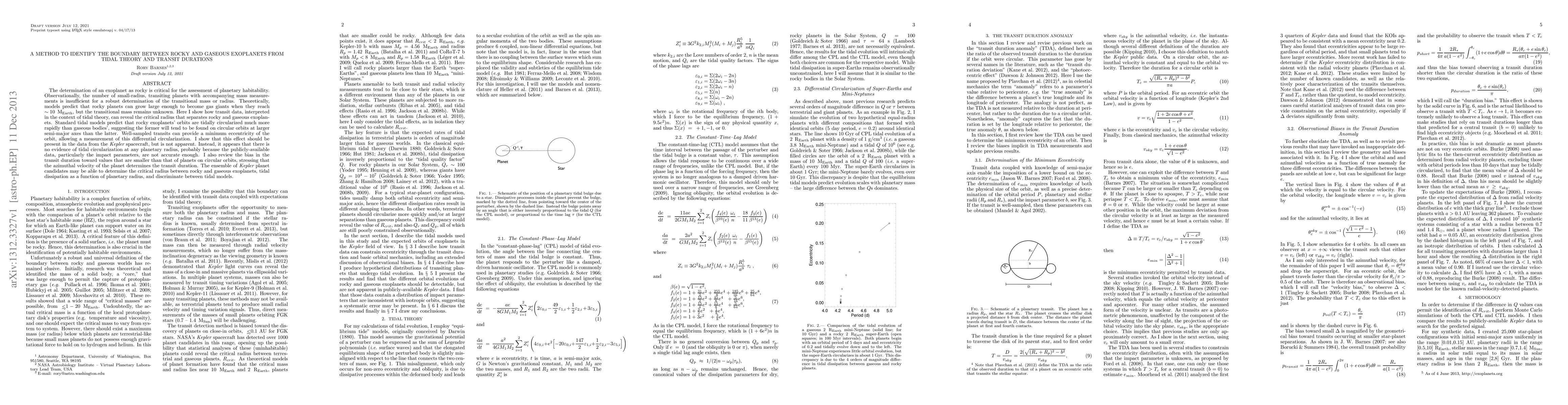 The determination of an exoplanet as rocky is critical for the assessment of planetary habitability. Observationally, the number of small-radius, transiting planets with accompanying mass measurements is insufficient for a robust determination of the transitional mass or radius. Theoretically, models predict that rocky planets can grow large enough to become gas giants when they reach ~10 Earth-masses, but the transitional mass remains unknown. Here I show how transit data, interpreted in the context of tidal theory, can reveal the critical radius that separates rocky and gaseous exoplanets. Standard tidal models predict that rocky exoplanets' orbits are tidally circularized much more rapidly than gaseous bodies', suggesting the former will tend to be found on circular orbits at larger semi-major axes than the latter. Well-sampled transits can provide a minimum eccentricity of the orbit, allowing a measurement of this differential circularization. I show that this effect should be present in the data from the Kepler spacecraft, but is not apparent. Instead, it appears that there is no evidence of tidal circularization at any planetary radius, probably because the publicly-available data, particularly the impact parameters, are not accurate enough. I also review the bias in the transit duration toward values that are smaller than that of planets on circular orbits, stressing that the azimuthal velocity of the planet determines the transit duration. The ensemble of Kepler planet candidates may be able to determine the critical radius between rocky and gaseous exoplanets, tidal dissipation as a function of planetary radius, and discriminate between tidal models.