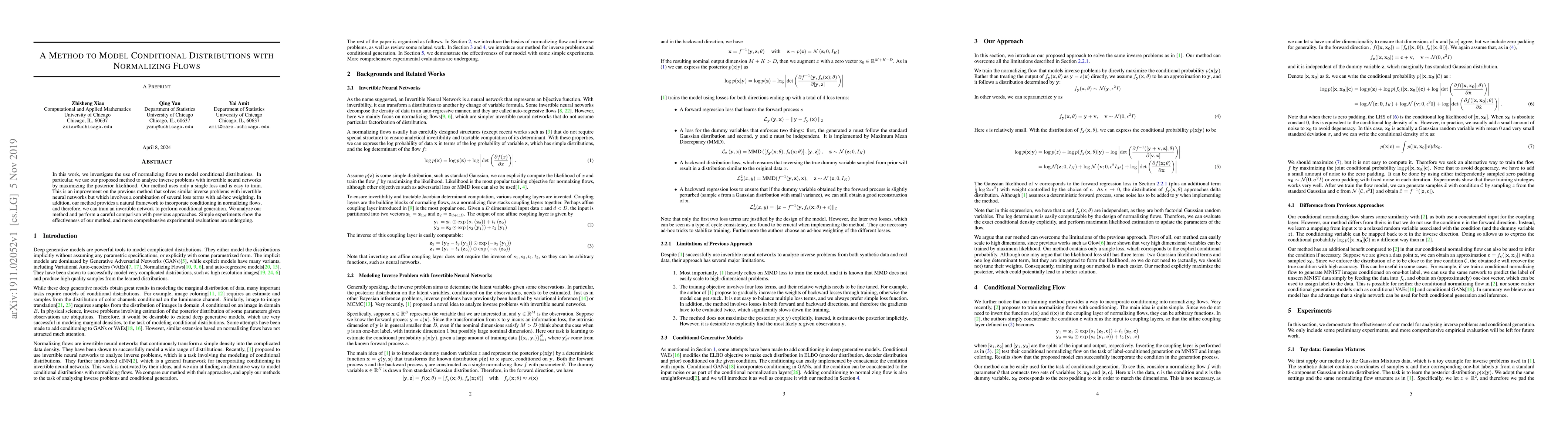 This research proposes a new method to model conditional distributions using normalizing flows, offering a single loss function that is easy to train and can perform both inverse problems and conditional generation.