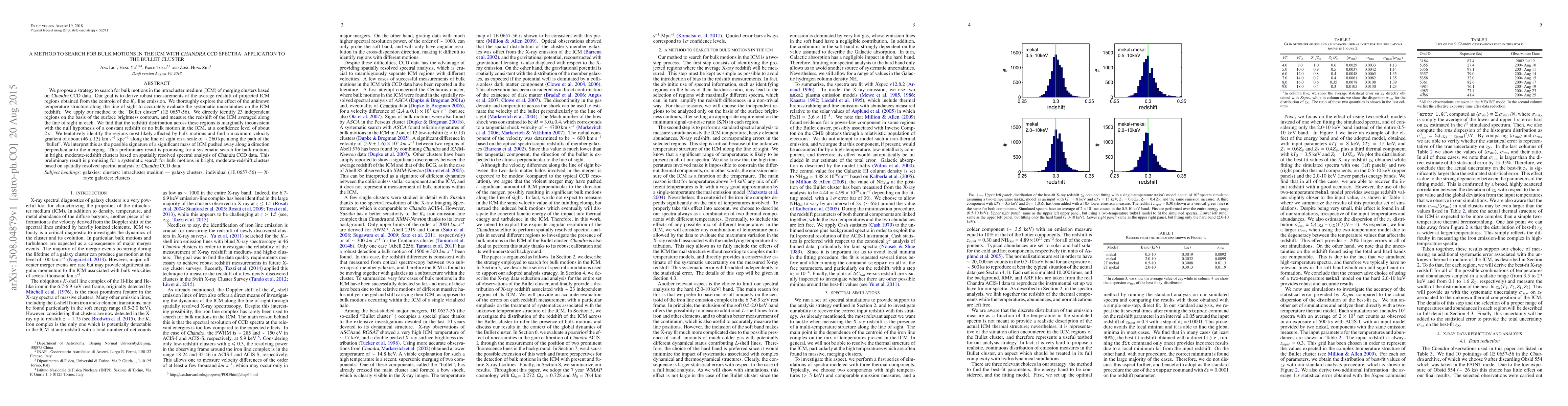 We propose a strategy to search for bulk motions in the intracluster medium (ICM) of merging clusters based on {\sl Chandra} CCD data. Our goal is to derive robust measurements of the average redshift of projected ICM regions obtained from the centroid of the $K_\alpha$ line emission. We thoroughly explore the effect of the unknown temperature structure along the line of sight to accurately evaluate the systematic uncertainties on the ICM redshift. We apply our method to the "Bullet cluster" (1E~0657-56). We directly identify 23 independent regions on the basis of the surface brightness contours, and measure the redshift of the ICM averaged along the line of sight in each. We find that the redshift distribution across these regions is marginally inconsistent with the null hypothesis of a constant redshift or no bulk motion in the ICM, at a confidence level of about $2\, \sigma$. We tentatively identify the regions most likely affected by bulk motions and find a maximum velocity gradient of about $(46\pm 13)$ $\rm km~s^{-1}~kpc^{-1}$ along the line of sight on a scale of $\sim 260 $ kpc along the path of the "bullet." We interpret this as the possible signature of a significant mass of ICM pushed away along a direction perpendicular to the merging. This preliminary result is promising for a systematic search for bulk motions in bright, moderate-redshift clusters based on spatially resolved spectral analysis of {\sl Chandra} CCD data. This preliminary result is promising for a systematic search for bulk motions in bright, moderate-redshift clusters based on spatially resolved spectral analysis of {\sl Chandra} CCD data.