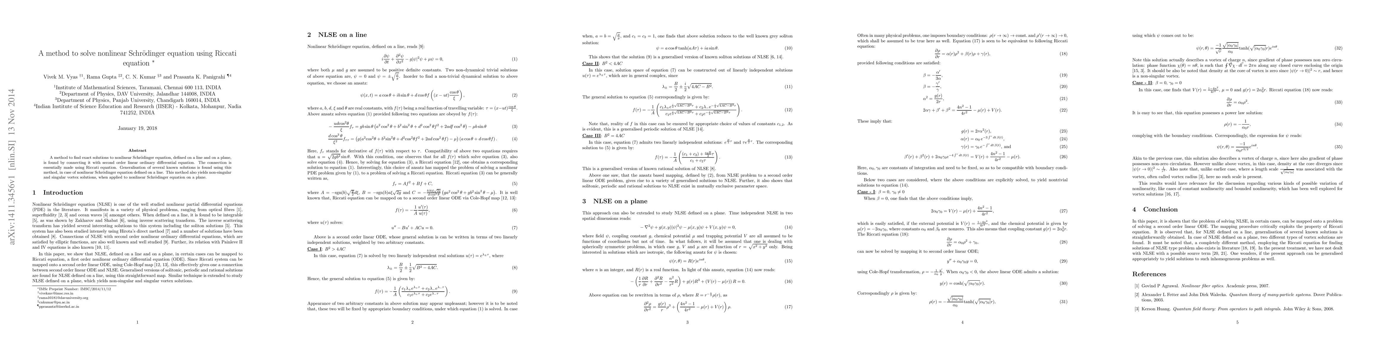 This paper presents a method to derive exact solutions for the nonlinear Schrödinger equation by linking it to a second-order linear ordinary differential equation via the Riccati equation. It generalizes known solutions and finds both non-singular and singular vortex solutions for the equation on a plane.