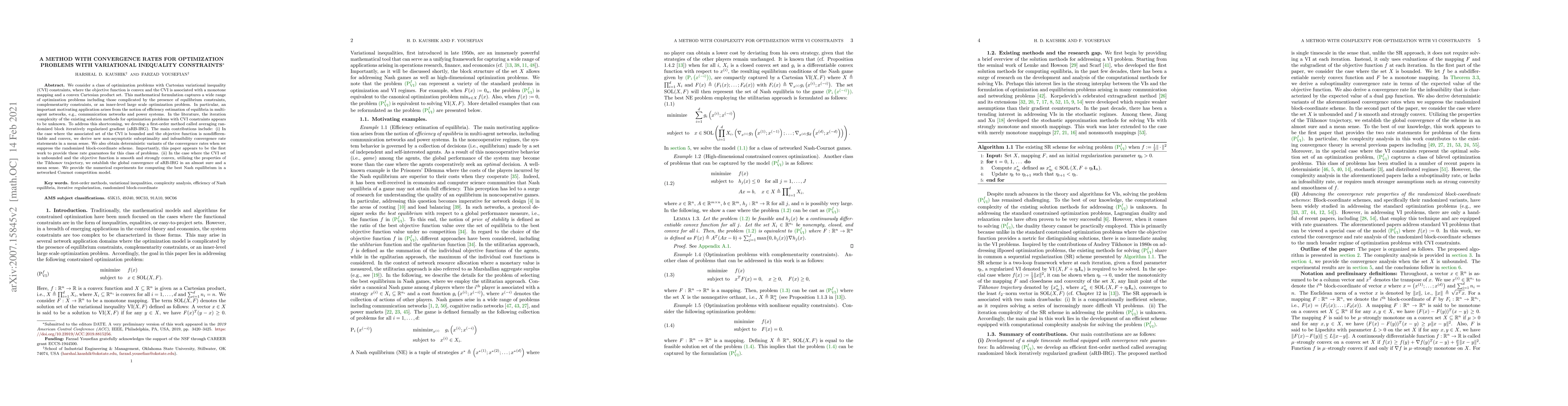 We consider a class of optimization problems with Cartesian variational inequality (CVI) constraints, where the objective function is convex and the CVI is associated with a monotone mapping and a convex Cartesian product set. This mathematical formulation captures a wide range of optimization problems including those complicated by the presence of equilibrium constraints, complementarity constraints, or an inner-level large scale optimization problem. In particular, an important motivating application arises from the notion of efficiency estimation of equilibria in multi-agent networks, e.g., communication networks and power systems. In the literature, the iteration complexity of the existing solution methods for optimization problems with CVI constraints appears to be unknown. To address this shortcoming, we develop a first-order method called averaging randomized block iteratively regularized gradient (aRB-IRG). The main contributions include: (i) In the case where the associated set of the CVI is bounded and the objective function is nondifferentiable and convex, we derive new non-asymptotic suboptimality and infeasibility convergence rate statements in a mean sense. We also obtain deterministic variants of the convergence rates when we suppress the randomized block-coordinate scheme. Importantly, this paper appears to be the first work to provide these rate guarantees for this class of problems. (ii) In the case where the CVI set is unbounded and the objective function is smooth and strongly convex, utilizing the properties of the Tikhonov trajectory, we establish the global convergence of aRB-IRG in an almost sure and a mean sense. We provide the numerical experiments for computing the best Nash equilibrium in a networked Cournot competition model.