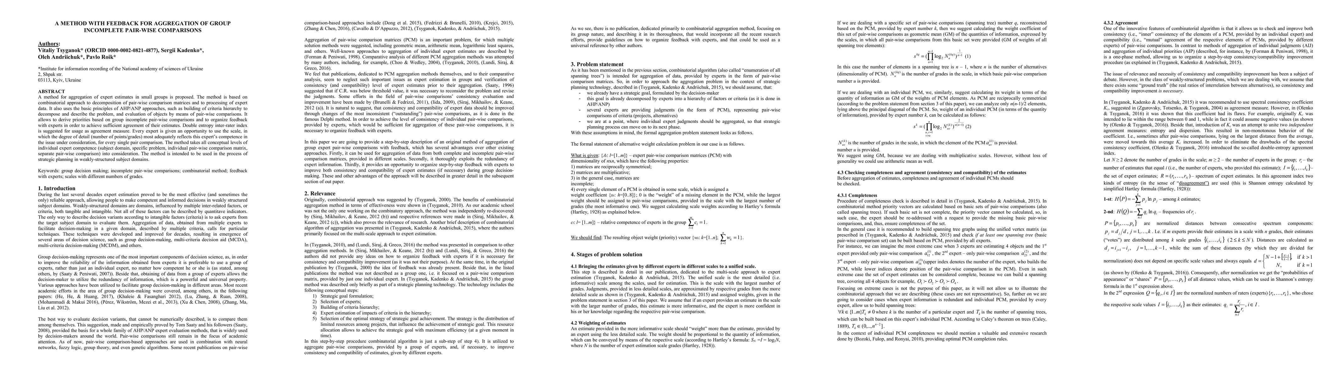 This paper proposes a combinatorial method for aggregating expert estimates in small groups, utilizing Analytic Hierarchy/Network Process principles, and incorporating feedback to enhance agreement among experts' incomplete pair-wise comparisons, with a double entropy inter-rater index for measuring agreement. The method is designed for strategic planning in weakly-structured domains.