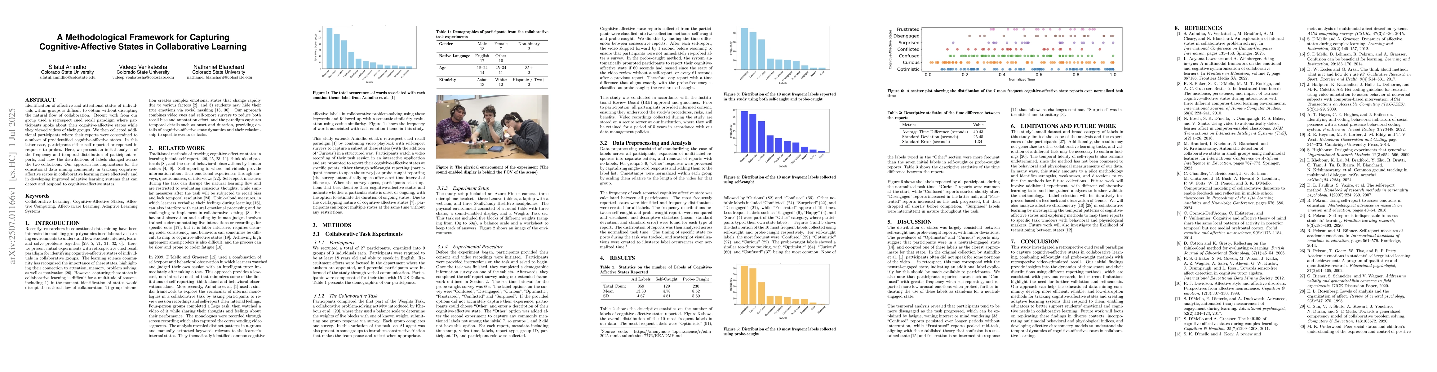 Identification of affective and attentional states of individuals within groups is difficult to obtain without disrupting the natural flow of collaboration. Recent work from our group used a retrospect cued recall paradigm where participants spoke about their cognitive-affective states while they viewed videos of their groups. We then collected additional participants where their reports were constrained to a subset of pre-identified cognitive-affective states. In this latter case, participants either self reported or reported in response to probes. Here, we present an initial analysis of the frequency and temporal distribution of participant reports, and how the distributions of labels changed across the two collections. Our approach has implications for the educational data mining community in tracking cognitive-affective states in collaborative learning more effectively and in developing improved adaptive learning systems that can detect and respond to cognitive-affective states.