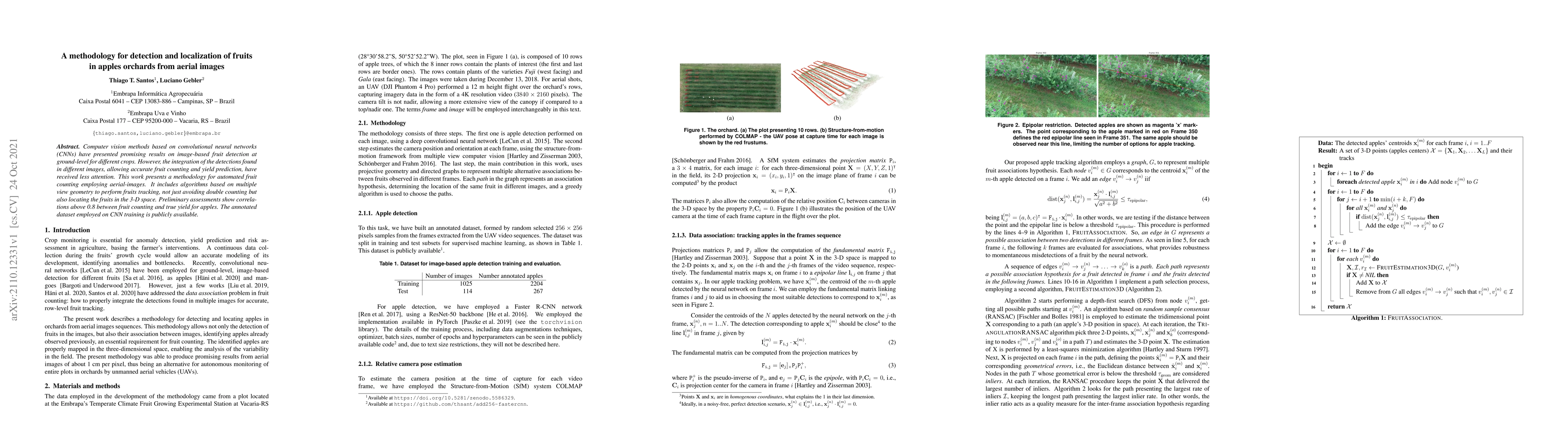 Computer vision methods based on convolutional neural networks (CNNs) have presented promising results on image-based fruit detection at ground-level for different crops. However, the integration of the detections found in different images, allowing accurate fruit counting and yield prediction, have received less attention. This work presents a methodology for automated fruit counting employing aerial-images. It includes algorithms based on multiple view geometry to perform fruits tracking, not just avoiding double counting but also locating the fruits in the 3-D space. Preliminary assessments show correlations above 0.8 between fruit counting and true yield for apples. The annotated dataset employed on CNN training is publicly available.