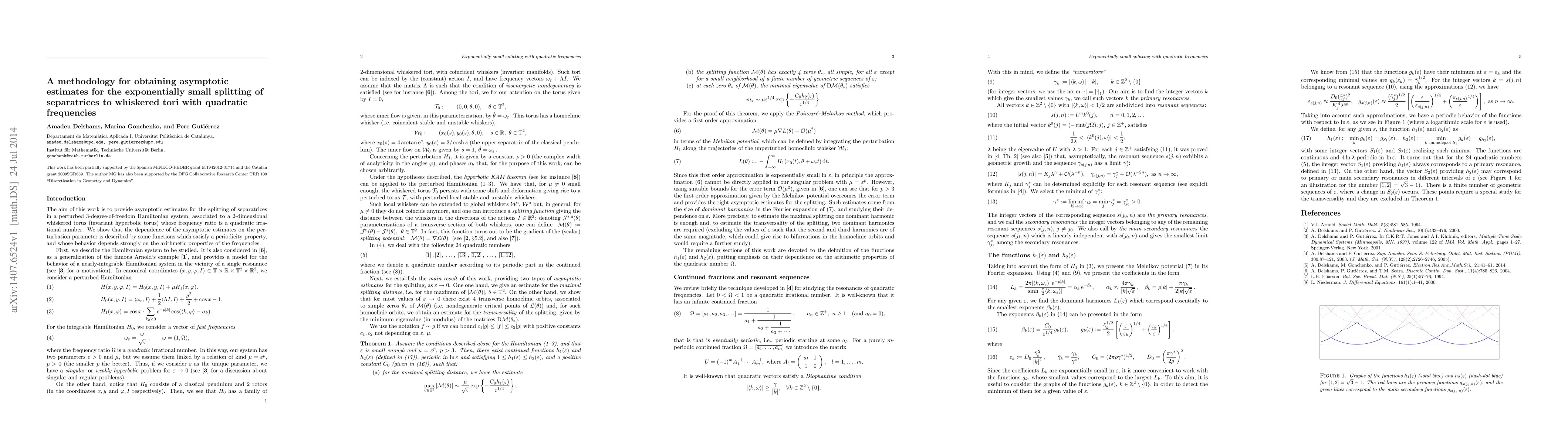 This research develops a methodology for obtaining asymptotic estimates for the exponentially small splitting of separatrices in perturbed Hamiltonian systems, particularly focusing on whiskered tori with quadratic irrational frequency ratios. The study reveals that the estimates depend on functions with a periodicity property, influenced significantly by the arithmetic characteristics of the frequencies.