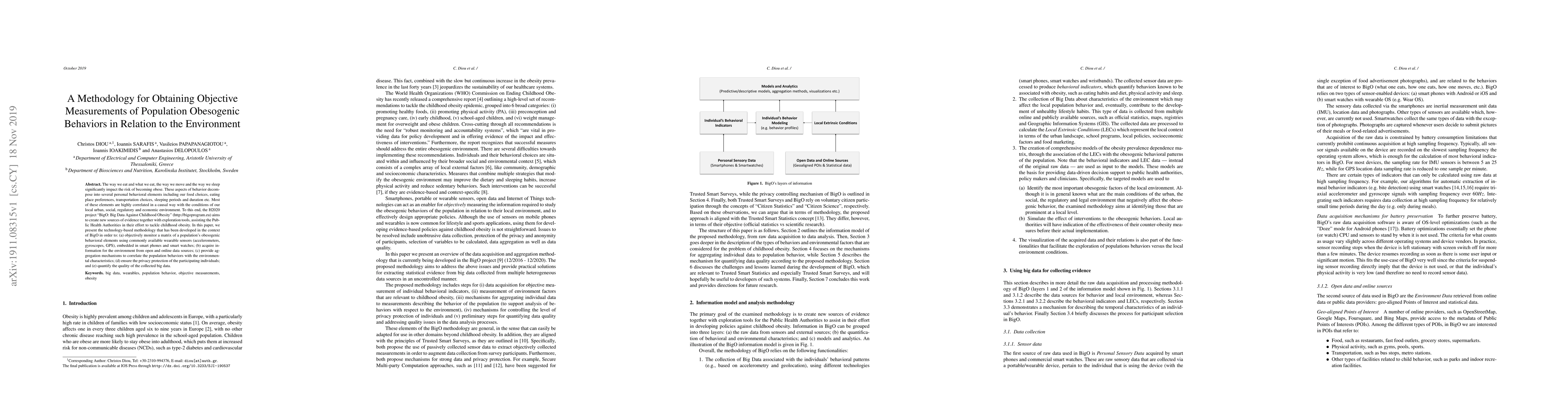 This research paper presents a technology-based methodology to objectively measure population obesogenic behaviors in relation to their environment, using wearable sensors and online data sources. The method aims to provide insights for tackling childhood obesity and ensure individual privacy.