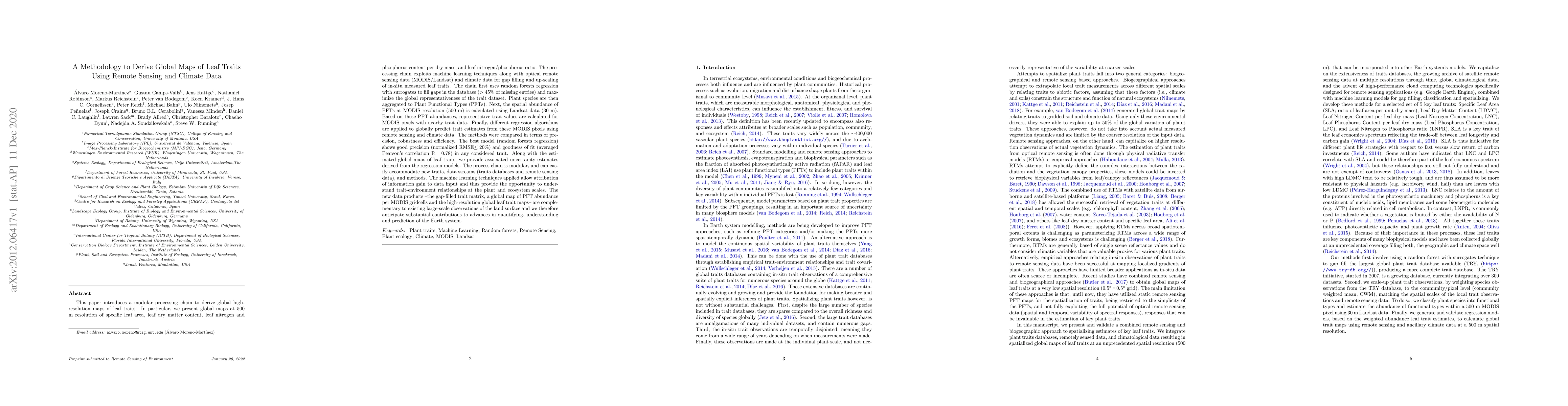 This paper introduces a modular processing chain to derive global high-resolution maps of leaf traits. In particular, we present global maps at 500 m resolution of specific leaf area, leaf dry matter content, leaf nitrogen and phosphorus content per dry mass, and leaf nitrogen/phosphorus ratio. The processing chain exploits machine learning techniques along with optical remote sensing data (MODIS/Landsat) and climate data for gap filling and up-scaling of in-situ measured leaf traits. The chain first uses random forests regression with surrogates to fill gaps in the database ($> 45 \% $ of missing entries) and maximize the global representativeness of the trait dataset. Along with the estimated global maps of leaf traits, we provide associated uncertainty estimates derived from the regression models. The process chain is modular, and can easily accommodate new traits, data streams (traits databases and remote sensing data), and methods. The machine learning techniques applied allow attribution of information gain to data input and thus provide the opportunity to understand trait-environment relationships at the plant and ecosystem scales.