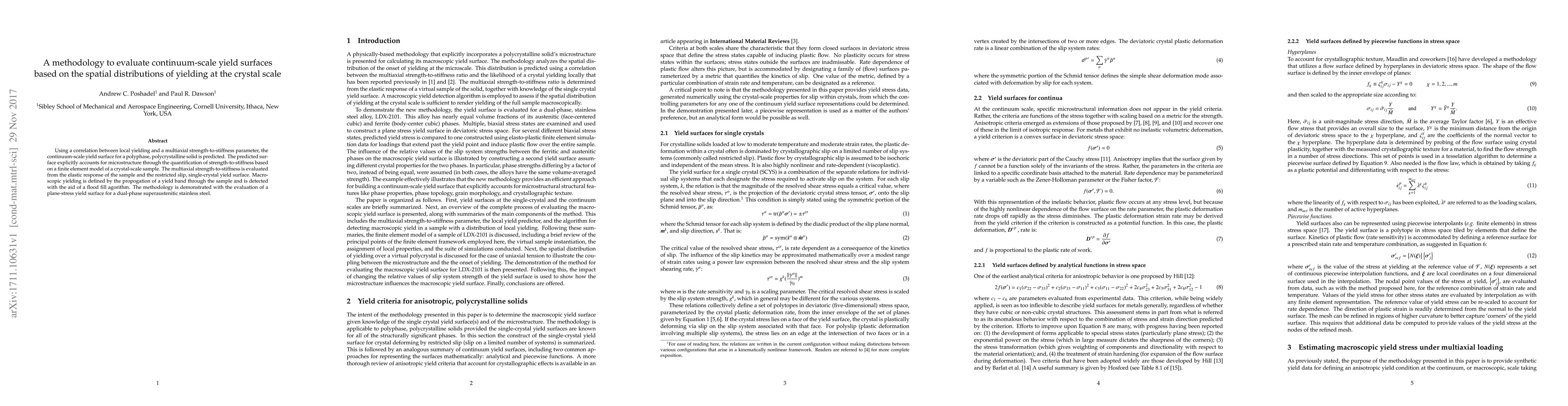 Using a correlation between local yielding and a multiaxial strength-to-stiffness parameter, the continuum-scale yield surface for a polyphase, polycrystalline solid is predicted. The predicted surface explicitly accounts for microstructure through the quantification of strength-to-stiffness based on a finite element model of a crystal-scale sample. The multiaxial strength-to-stiffness is evaluated from the elastic response of the sample and the restricted slip, single-crystal yield surface. Macroscopic yielding is defined by the propogation of a yield band through the sample and is detected with the aid of a flood fill agorithm. The methodology is demonstrated with the evaluation of a plane-stress yield surface for a dual-phase superaustenitic stainless steel.