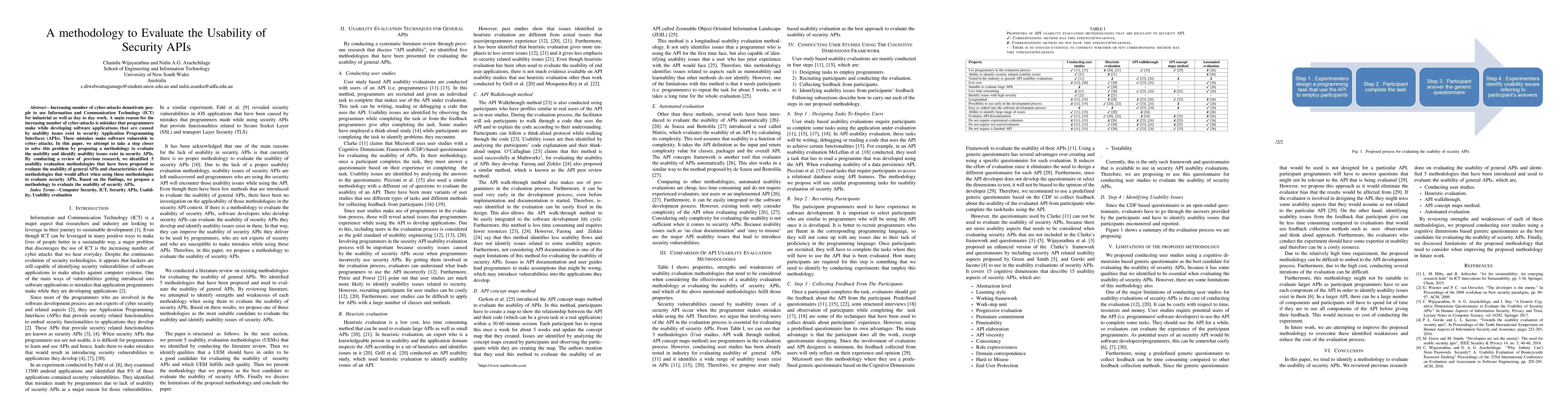 Increasing number of cyber-attacks demotivate people to use Information and Communication Technology (ICT) for industrial as well as day to day work. A main reason for the increasing number of cyber-attacks is mistakes that programmers make while developing software applications that are caused by usability issues exist in security Application Programming Interfaces (APIs). These mistakes make software vulnerable to cyber-attacks. In this paper, we attempt to take a step closer to solve this problem by proposing a methodology to evaluate the usability and identify usability issues exist in security APIs. By conducting a review of previous research, we identified 5 usability evaluation methodologies that have been proposed to evaluate the usability of general APIs and characteristics of those methodologies that would affect when using these methodologies to evaluate security APIs. Based on the findings, we propose a methodology to evaluate the usability of security APIs.