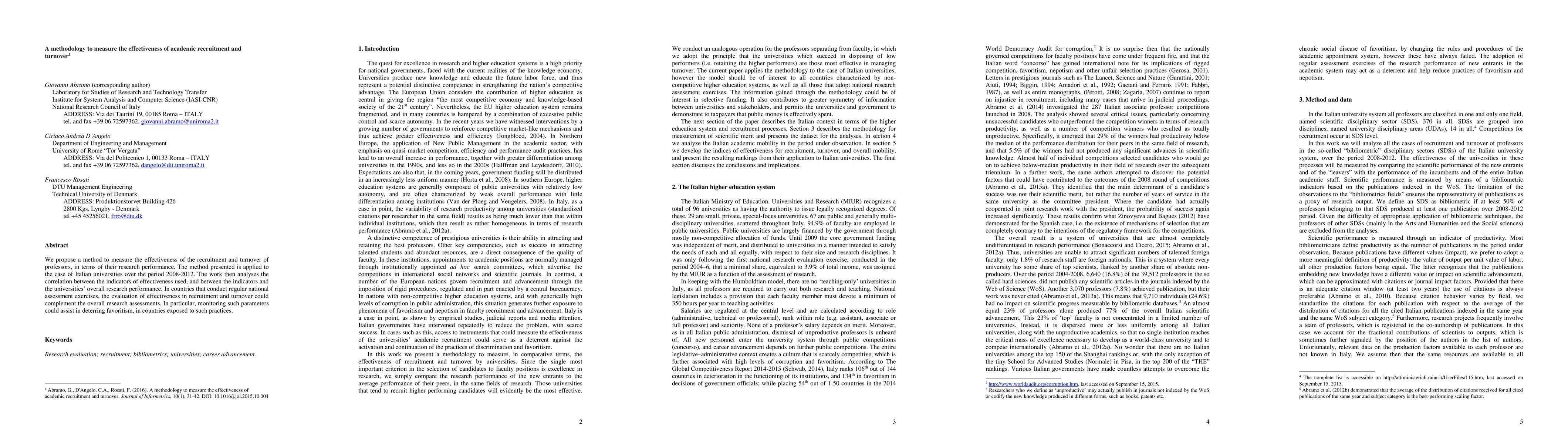 We propose a method to measure the effectiveness of the recruitment and turnover of professors, in terms of their research performance. The method presented is applied to the case of Italian universities over the period 2008-2012. The work then analyses the correlation between the indicators of effectiveness used, and between the indicators and the universities' overall research performance. In countries that conduct regular national assessment exercises, the evaluation of effectiveness in recruitment and turnover could complement the overall research assessments. In particular, monitoring such parameters could assist in deterring favoritism, in countries exposed to such practices.