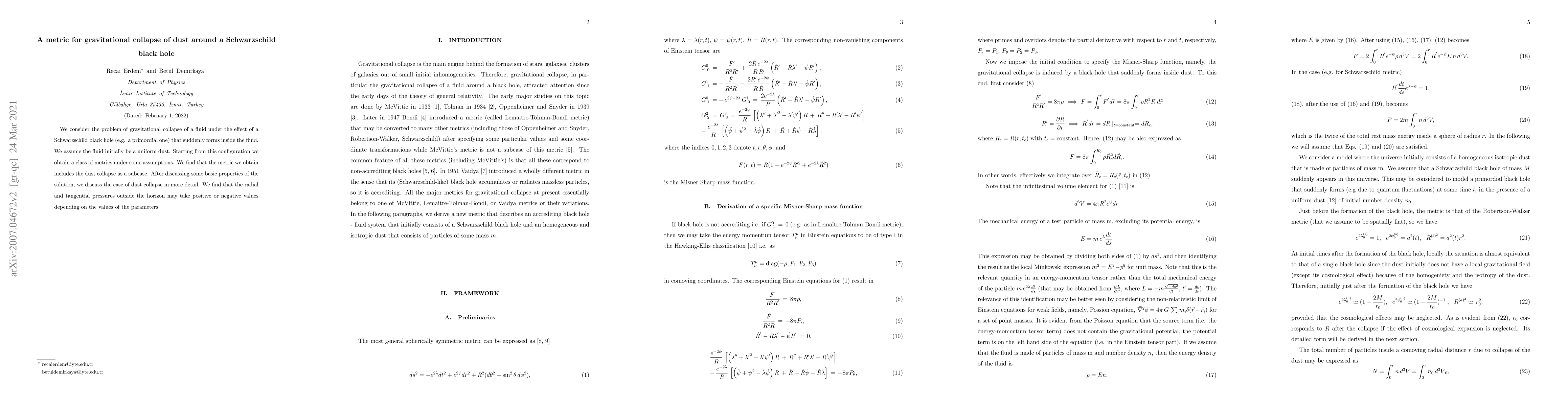 This paper develops a metric for the gravitational collapse of uniform dust around a Schwarzschild black hole, deriving a class of solutions that encompass dust collapse scenarios. The analysis reveals that radial and tangential pressures outside the horizon can vary in sign based on parameter values.