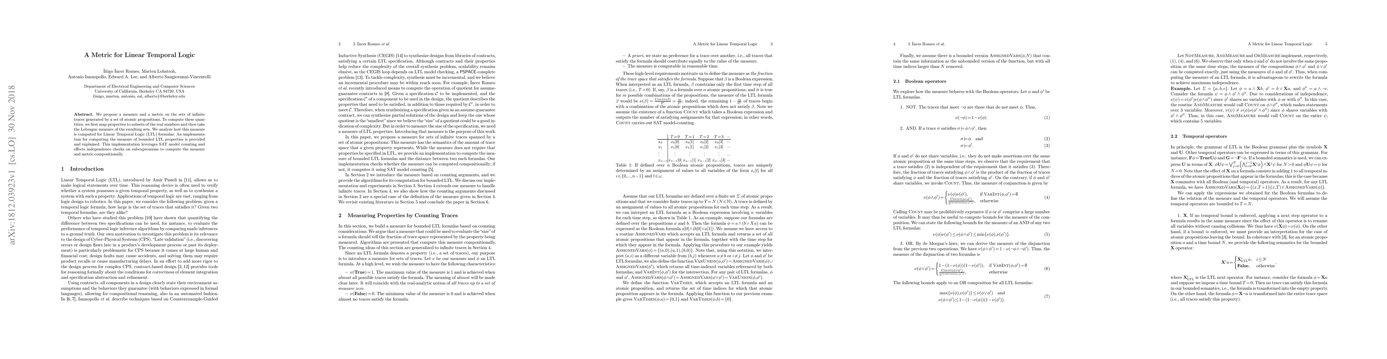 This paper introduces a metric for Linear Temporal Logic (LTL) based on the Lebesgue measure of properties mapped to subsets of real numbers. It provides an implementation leveraging SAT model counting and independence checks for computing measures of bounded LTL properties compositionally.