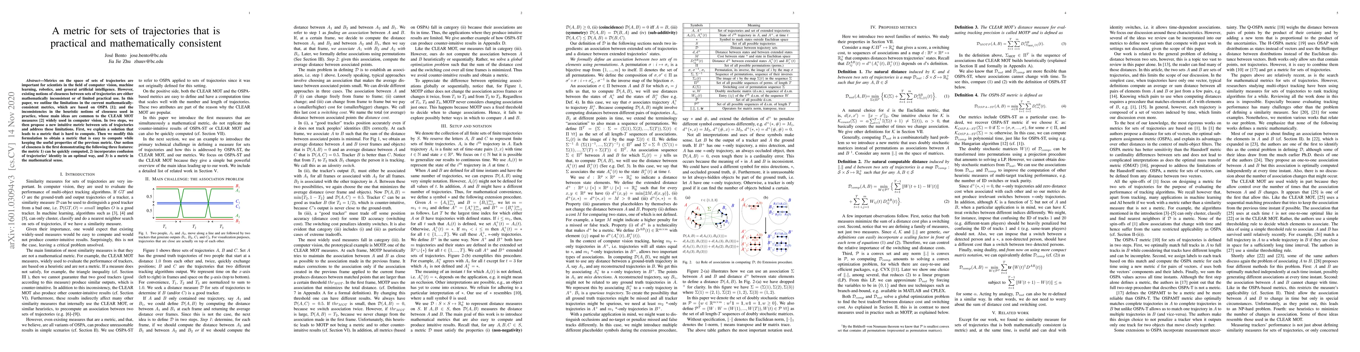 Metrics on the space of sets of trajectories are important for scientists in the field of computer vision, machine learning, robotics, and general artificial intelligence. However, existing notions of closeness between sets of trajectories are either mathematically inconsistent or of limited practical use. In this paper, we outline the limitations in the current mathematically-consistent metrics, which are based on OSPA (Schuhmacher et al. 2008); and the inconsistencies in the heuristic notions of closeness used in practice, whose main ideas are common to the CLEAR MOT measures (Keni and Rainer 2008) widely used in computer vision. In two steps, we then propose a new intuitive metric between sets of trajectories and address these limitations. First, we explain a solution that leads to a metric that is hard to compute. Then we modify this formulation to obtain a metric that is easy to compute while keeping the useful properties of the previous metric. Our notion of closeness is the first demonstrating the following three features: the metric 1) can be quickly computed, 2) incorporates confusion of trajectories' identity in an optimal way, and 3) is a metric in the mathematical sense.