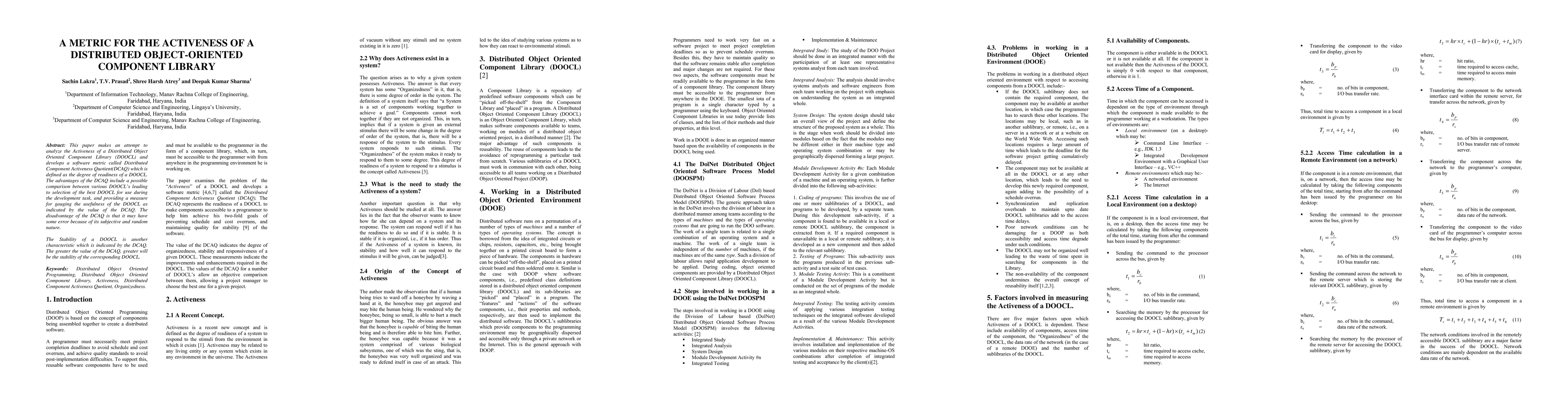 This paper makes an attempt to analyze the Activeness of a Distributed Object Oriented Component Library and develops a software metric called Distributed Component Activeness Quotient which is defined as the degree of readiness of a DOOCL. The advantages of the DCAQ include a possible comparison between various DOOCLs leading to selection of the best DOOCL for use during the development task, and providing a measure for gauging the usefulness of the DOOCL as indicated by the value of the DCAQ. The disadvantage of the DCAQ is that it may have some error because of its subjective and random nature. The Stability of a DOOCL is another characteristic which is indicated by the DCAQ. The greater the value of the DCAQ, greater will be the stability of the corresponding DOOCL.