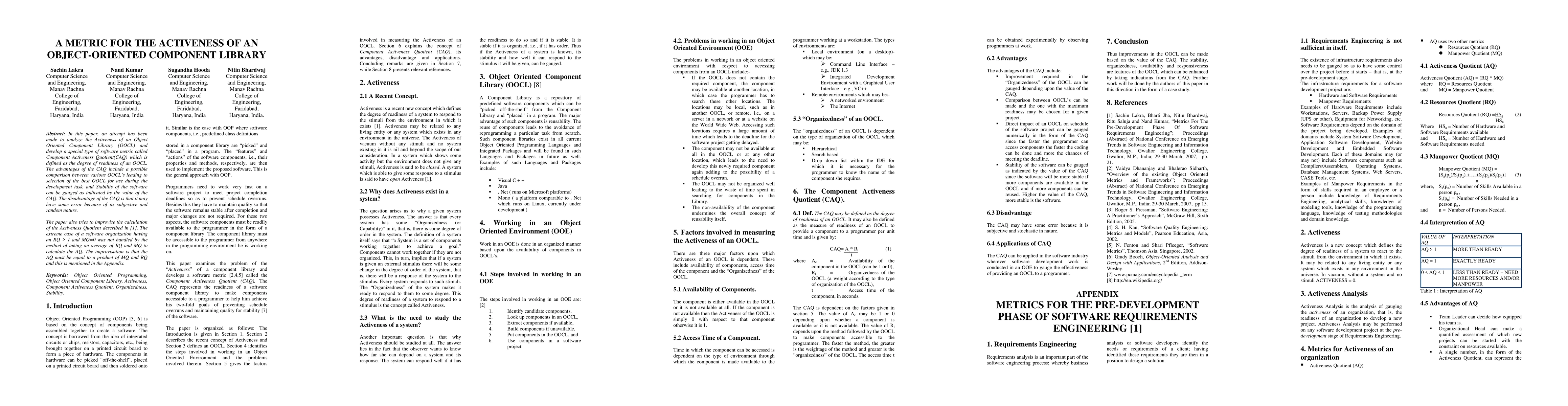 In this paper, an attempt has been made to analyze the Activeness of an Object Oriented Component Library and develop a special type of software metric called Component Activeness Quotient which is defined as the degree of readiness of an OOCL. The advantages of the CAQ include a possible comparison between various OOCLs leading to selection of the best OOCL for use during the development task, and Stability of the software can be gauged as indicated by the value of the CAQ. The disadvantage of the CAQ is that it may have some error because of its subjective and random nature. The paper also tries to improvise the calculation of the Activeness Quotient. The extreme case of a software organization having an RQ greater than 1 and MQ equal to 0 was not handled by the method of taking an average of RQ and MQ to calculate the AQ. The improvisation is that the AQ must be equal to a product of MQ and RQ and this is mentioned in the Appendix.