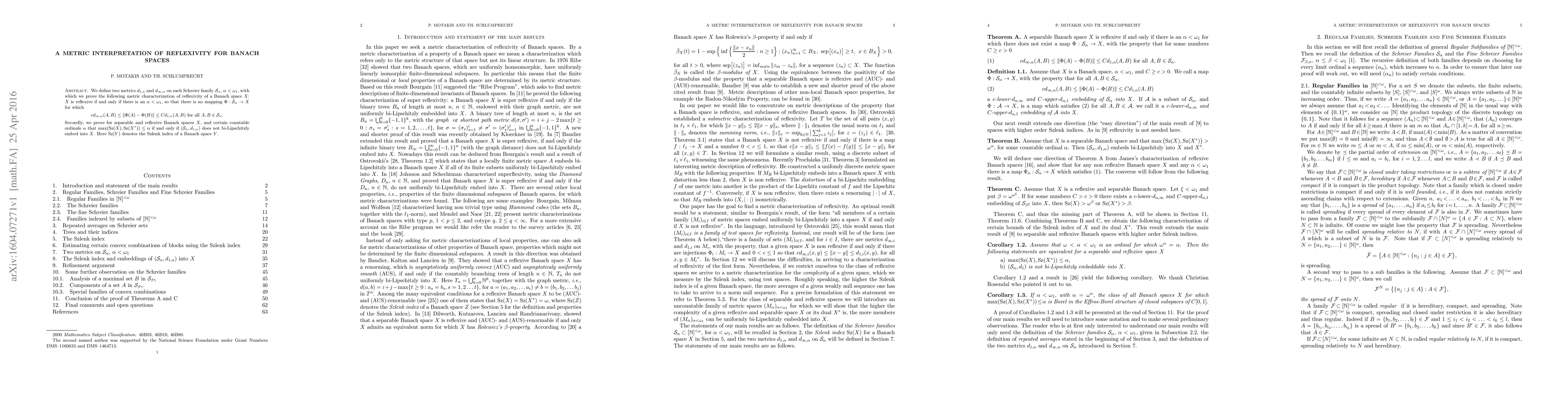 We define two metrics $d_{1,\alpha}$ and $d_{\infty,\alpha}$ on each Schreier family $\mathcal{S}_\alpha$, $\alpha<\omega_1$, with which we prove the following metric characterization of reflexivity of a Banach space $X$: $X$ is reflexive if and only if there is an $\alpha<\omega_1$, so that there is no mapping $\Phi:\mathcal{S}_\alpha\to X$ for which $$ cd_{\infty,\alpha}(A,B)\le \|\Phi(A)-\Phi(B)\|\le C d_{1,\alpha}(A,B) \text{ for all $A,B\in\mathcal{S}_\alpha$.}$$ Secondly, we prove for separable and reflexive Banach spaces $X$, and certain countable ordinals $\alpha$ that $\max(\text{ Sz}(X),\text{ Sz}(X^*))\le \alpha$ if and only if $({\mathcal S}_\alpha, d_{1,\alpha})$ does not bi-Lipschitzly embed into $X$. Here $\text{Sz}(Y)$ denotes the Szlenk index of a Banach space $Y$.