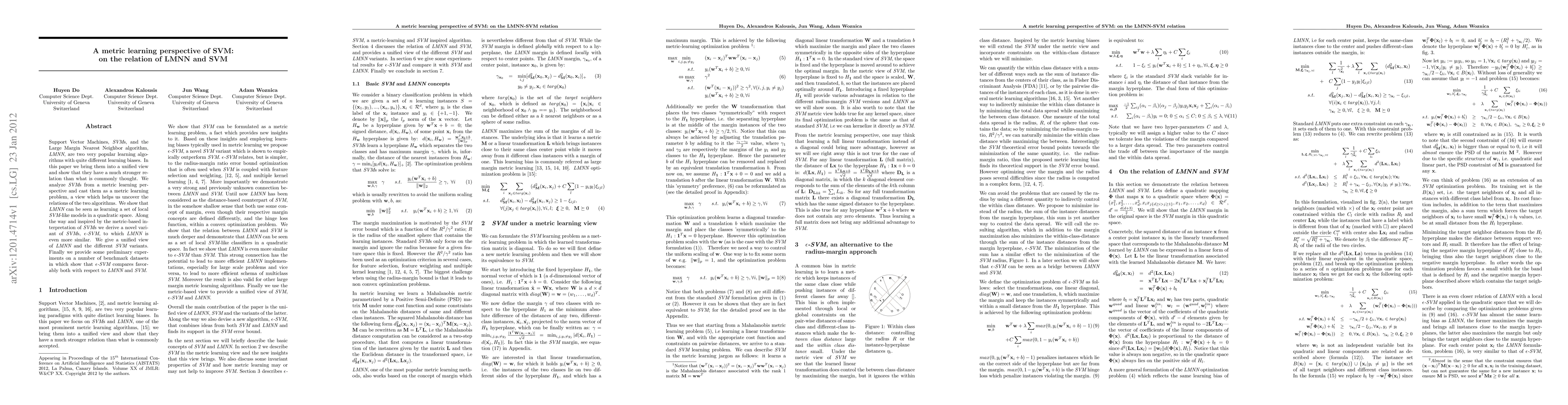 This paper unifies Support Vector Machines (SVMs) and the Large Margin Nearest Neighbor (LMNN) algorithm by viewing SVMs through a metric learning lens, revealing a closer relationship than previously thought. It introduces epsilon-SVM, a novel variant, and demonstrates that LMNN can be seen as learning local SVM-like models, ultimately showing epsilon-SVM's competitive performance on benchmark datasets.