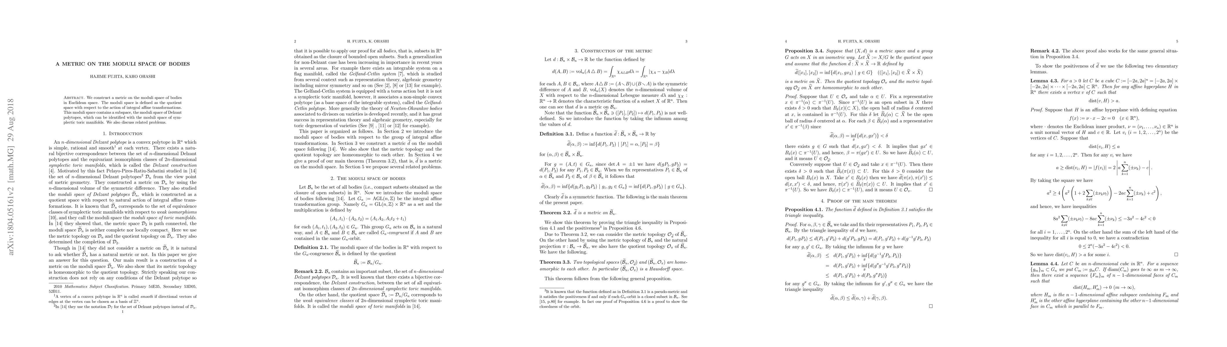 Researchers created a metric on the moduli space of bodies in Euclidean space, enabling analysis of symplectic toric manifolds and related geometric structures.