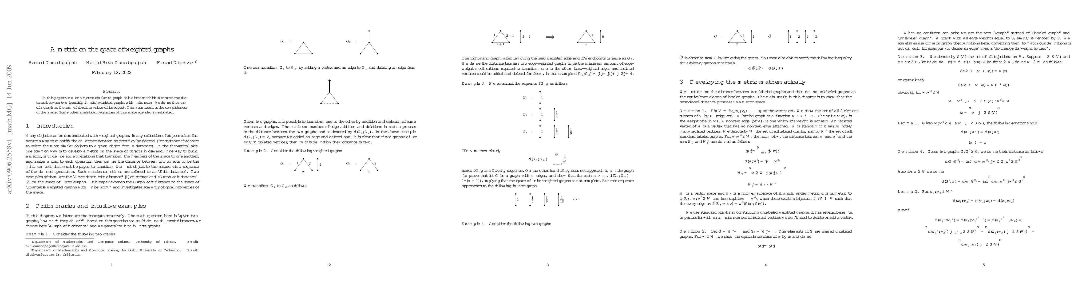 In this paper we offer a metric similar to graph edit distance which measures the distance between two (possibly infinite)weighted graphs with finite norm (we define the norm of a graph as the sum of absolute values of its edges). The main result is the completeness of the space. Some other analytical properties of this space are also investigated. The introduced metric could have some applications in pattern recognition and face recognition methods.