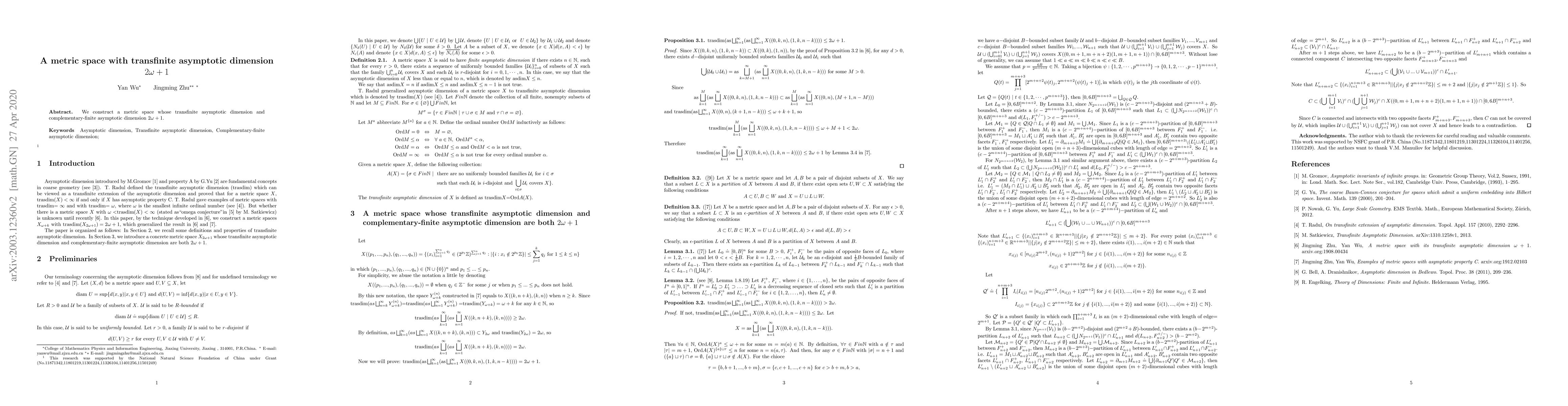 This paper constructs a novel metric space with a transfinite asymptotic dimension of $2\omega+1$, illustrating a new example in the study of geometric group theory and large-scale geometry. The complementary-finite asymptotic dimension is also determined to be $2\omega+1$.