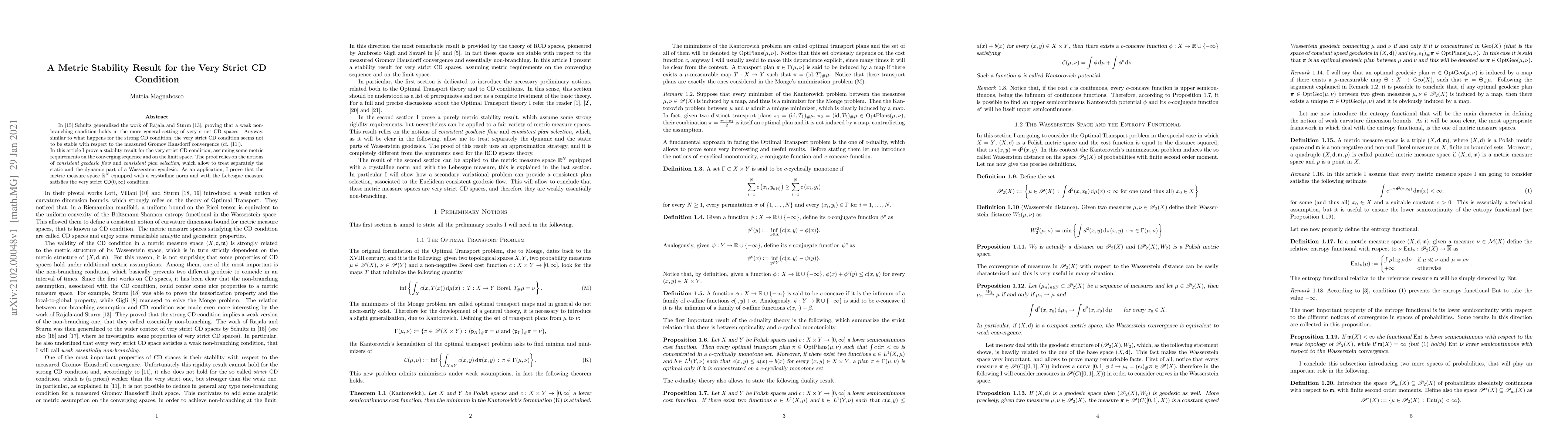 Researchers prove a stability result for the very strict CD condition, showing that a specific metric measure space satisfies this condition with certain assumptions on convergence and limit spaces.