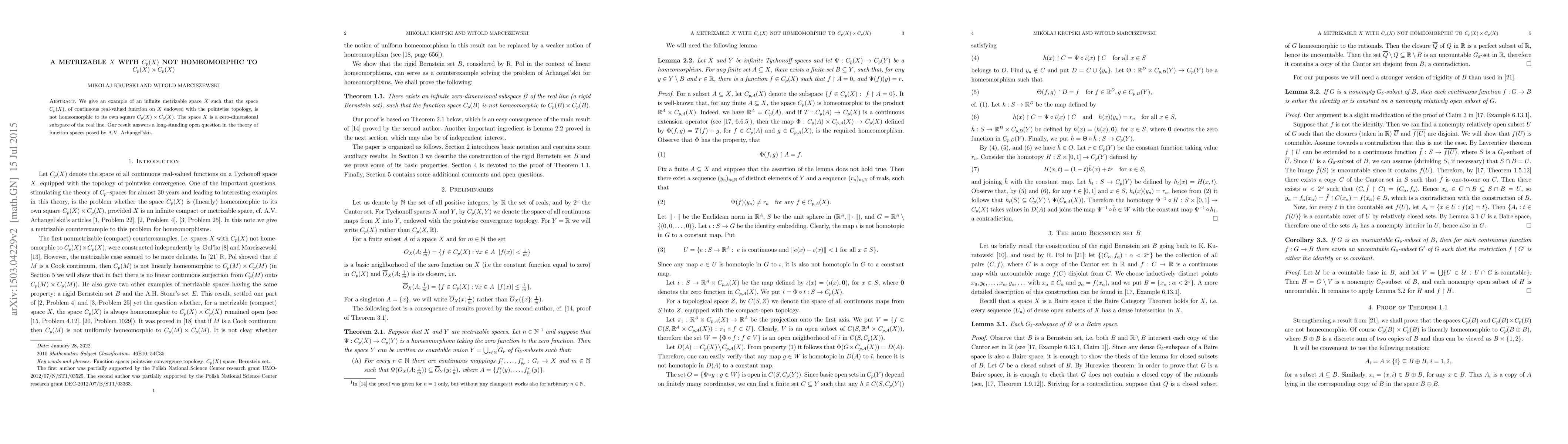 This paper presents an infinite metrizable space $X$ where the function space $C_p(X)$ is not homeomorphic to $C_p(X) \times C_p(X)$, answering a longstanding question in function space theory by A.V. Arhangel'skii. The space $X$ is a zero-dimensional subspace of the real line.