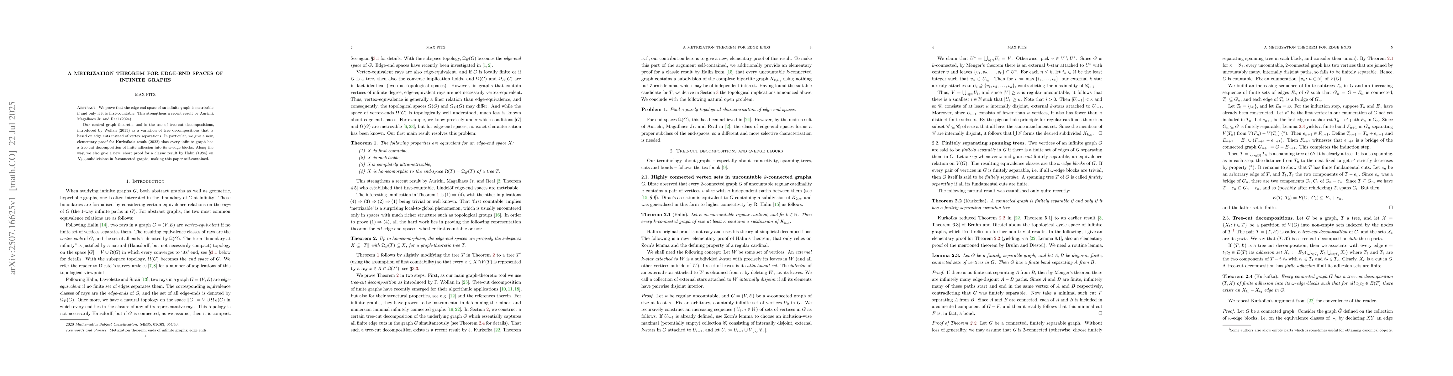 We prove that the edge-end space of an infinite graph is metrizable if and only if it is first-countable. This strengthens a recent result by Aurichi, Magalhaes Jr.\ and Real (2024). Our central graph-theoretic tool is the use of tree-cut decompositions, introduced by Wollan (2015) as a variation of tree decompositions that is based on edge cuts instead of vertex separations. In particular, we give a new, elementary proof for Kurkofka's result (2022) that every infinite graph has a tree-cut decomposition of finite adhesion into its $\omega$-edge blocks. Along the way, we also give a new, short proof for a classic result by Halin (1984) on $K_{k,\kappa}$-subdivisions in $k$-connected graphs, making this paper self-contained.