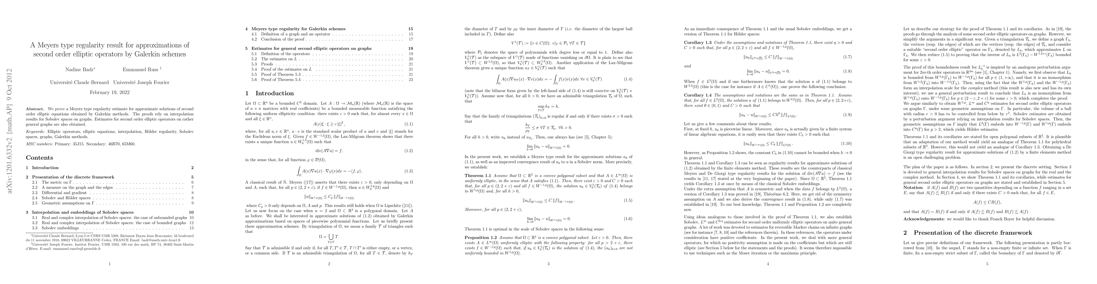 We prove a Meyers type regularity estimate for approximate solutions of second order elliptic equations obtained by Galerkin methods. The proofs rely on interpolation results for Sobolev spaces on graphs. Estimates for second order elliptic operators on rather general graphs are also obtained.